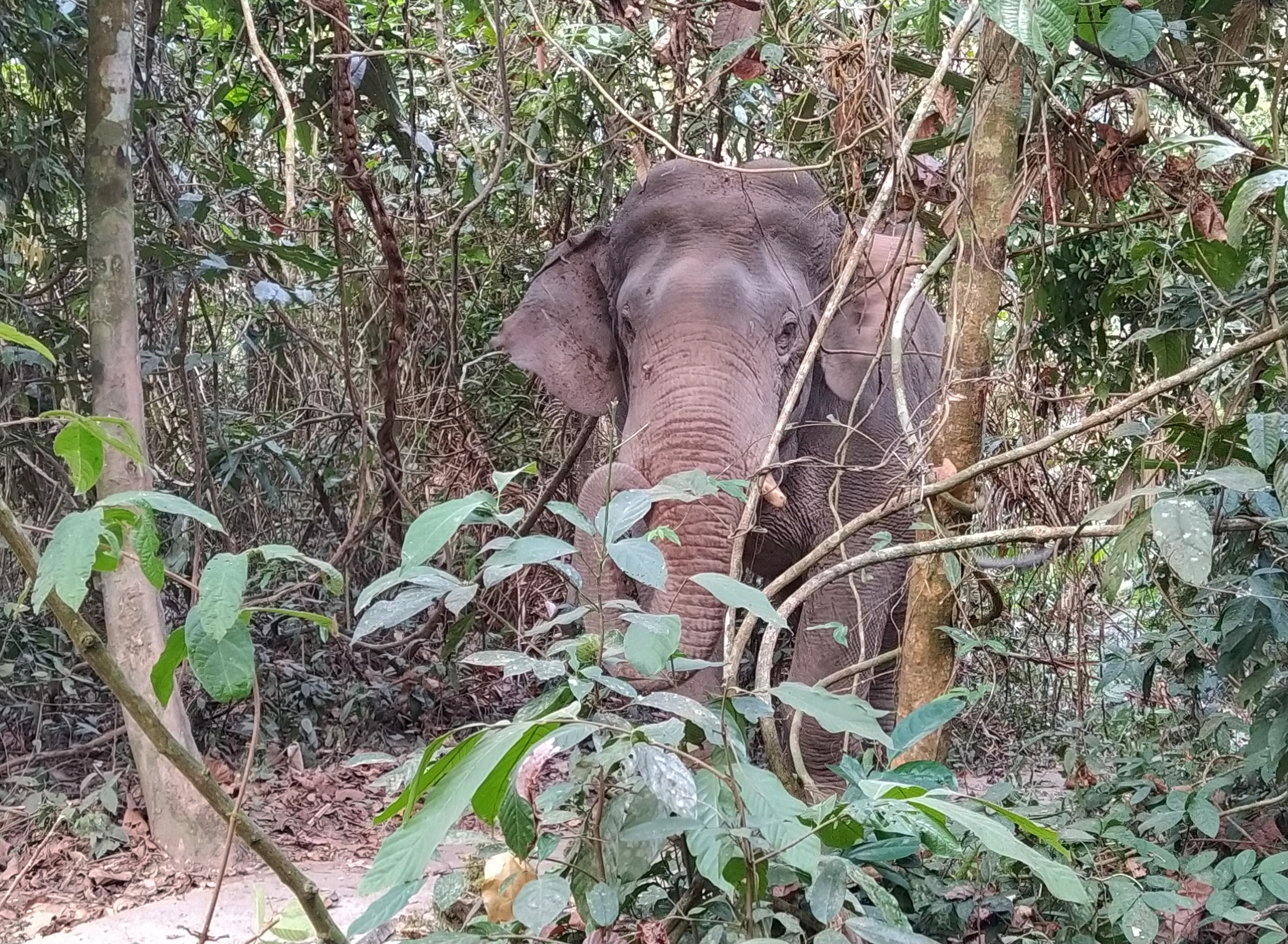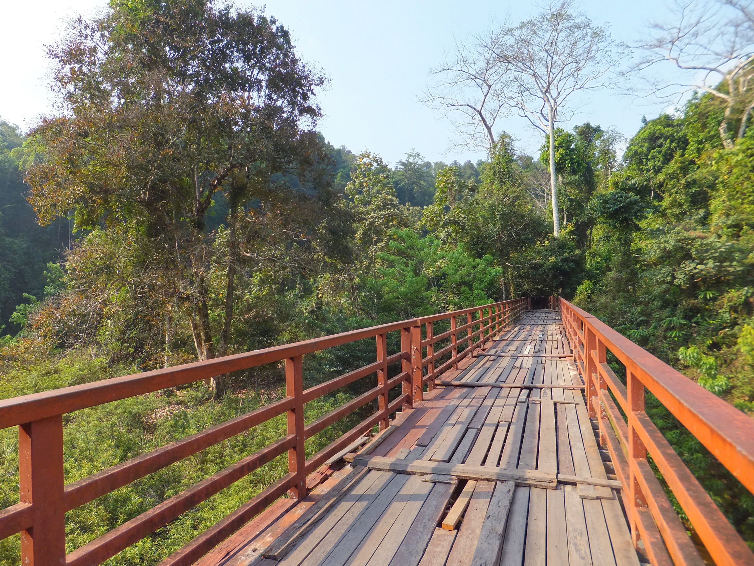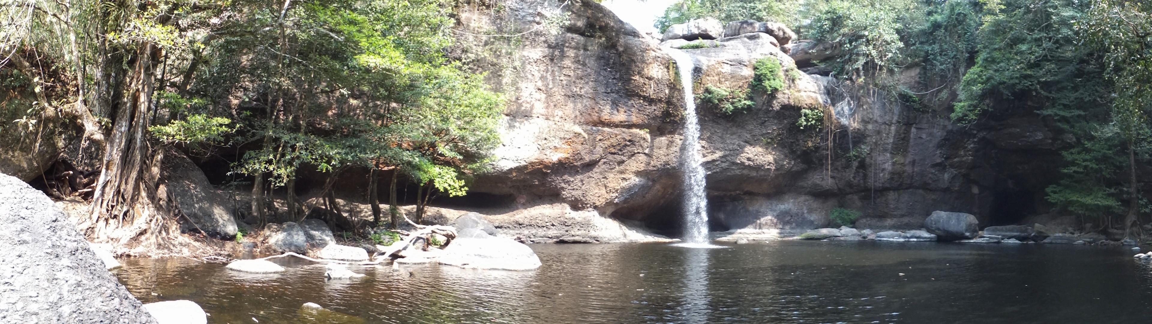 Zu unserem Glück kannte der Vermieter unseres Bungalows jemanden, der einen Bus mit Fahrer vermietete. Morgens um 8 Uhr wurden wir abgeholt und fuhren ganz bequem zu zweit in einem klimatisierten Minivan zum Khao Yai Nationalpark. Der Fahrer sprach zwar kein Englisch aber mit Hilfe von Google Maps, dem Übersetzer, Karten und Gesten war es kein Problem uns zu verständigen. Wir hielten an den Stellen, die wir uns auf der interaktiven Karte des Parks ausgesucht hatten, machten kleine und größere Wanderungen und immer wartete der Fahrer freundlich lächelnd auf uns und brachte uns dann zum nächsten Ziel. Am Parkplatz des großen Wasserfalls hieß es, dass kein Wasser da sei. Wir entschieden uns dennoch, die Wanderung zu machen. Entlang eines gut befestigten Weges ging es durch den Dschungel. Wir waren ganz alleine und hörten nur die Geräusche des Bambuswaldes. Der Weg führte über eine etwas baufällige Brücke, in der schon einige Planken fehlten. Und plötzlich, der Weg machte eine kleine Biegung, stand ein Elefant mitten auf dem Weg direkt vor uns. Wir schauten uns gegenseitig an. Keine drei Meter von uns entfernt stand das Tier und blickte uns direkt in die Augen. Nachdem wir unseren ersten Schreck überwunden hatten, gingen wir ein paar Schritte abseits des Weges in den Dschungel hinein. Auch der Elefant ging zunächst ein paar Schritte zurück und erleichterte sich ausgiebig. Dann kam er erneut näher und wandte sich uns zu. Wieder blickten wir uns direkt in die Augen, diesmal noch etwas dichter dran. Keine zwei Meter und ein hauchdünnes Bäumchen trennten uns. Wir gingen noch etwas tiefer in den Dschungel, offensichtlich genug, denn jetzt wandte er sich von uns ab und ging gemächlich den Weg weiter. Wir gingen ebenfalls weiter und schauten uns den fast trockenen Wasserfall an. Auf dem Rückweg entdeckten wir den Elefanten noch einmal auf der anderen Seite des Flusses.