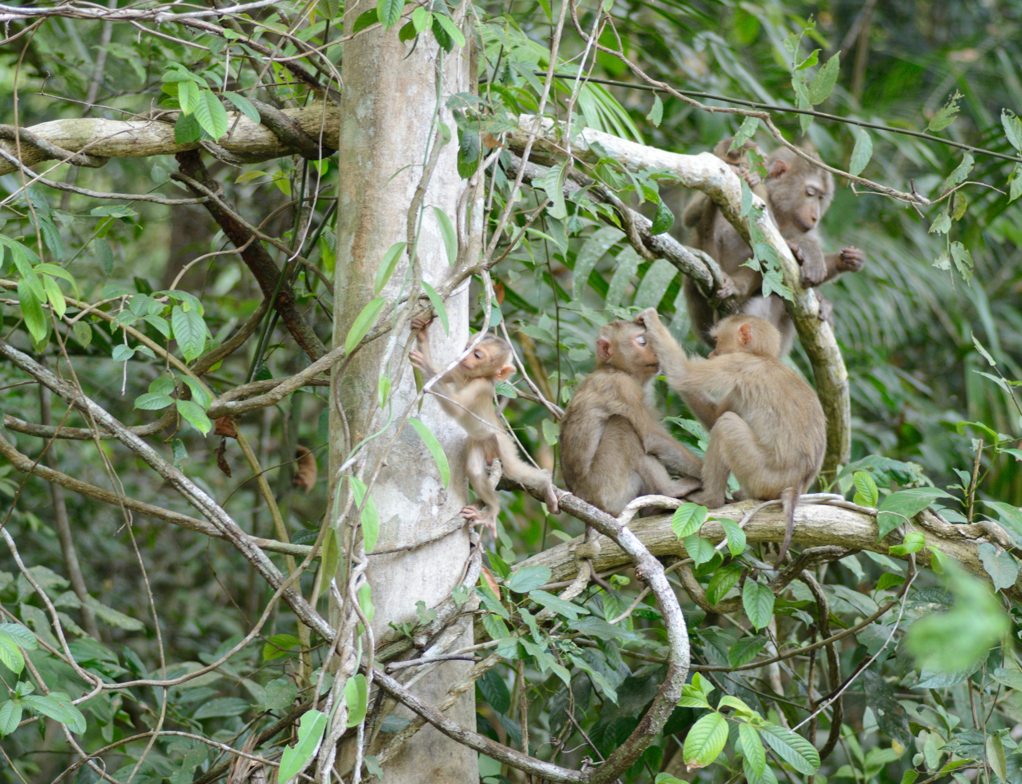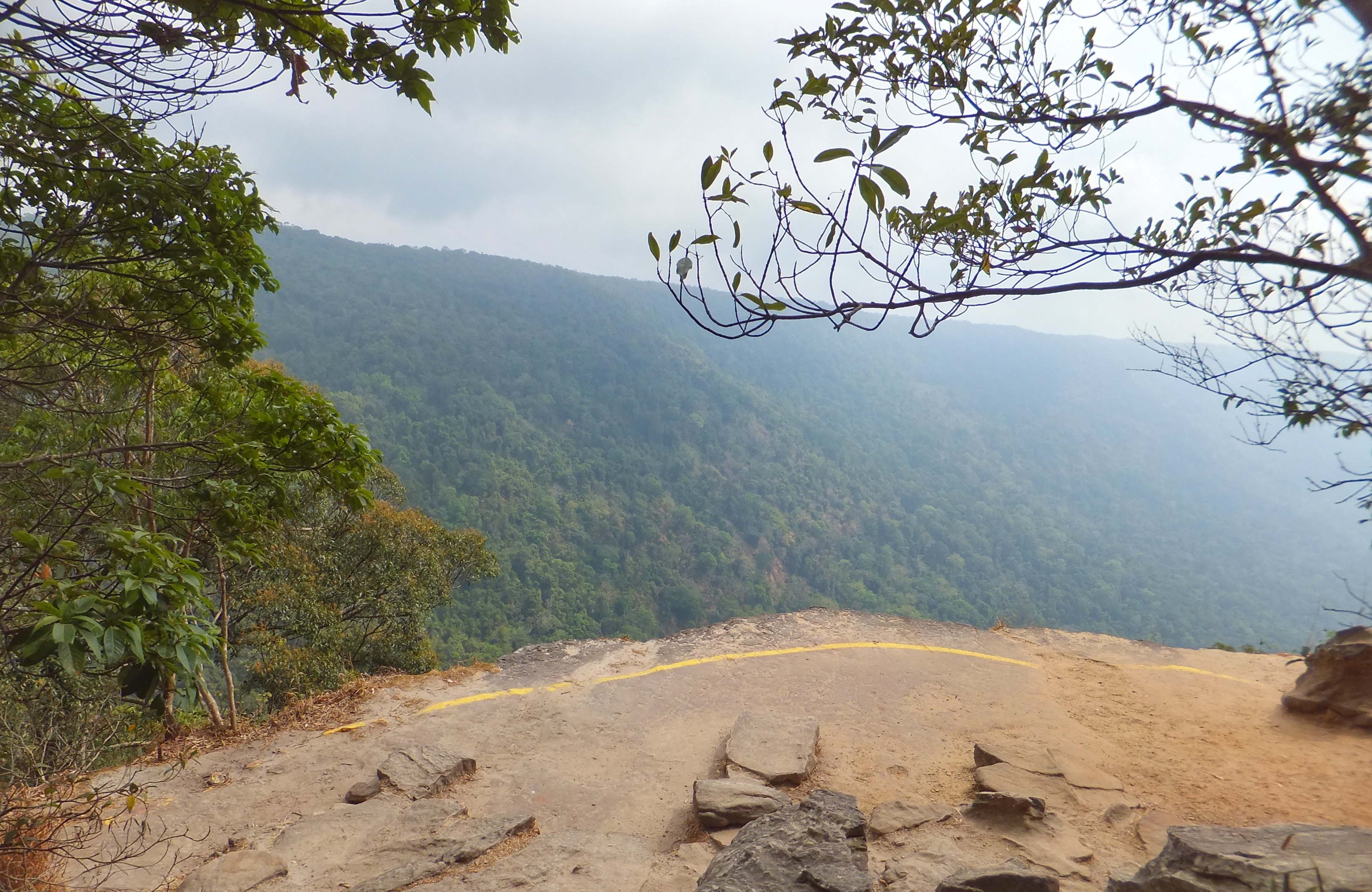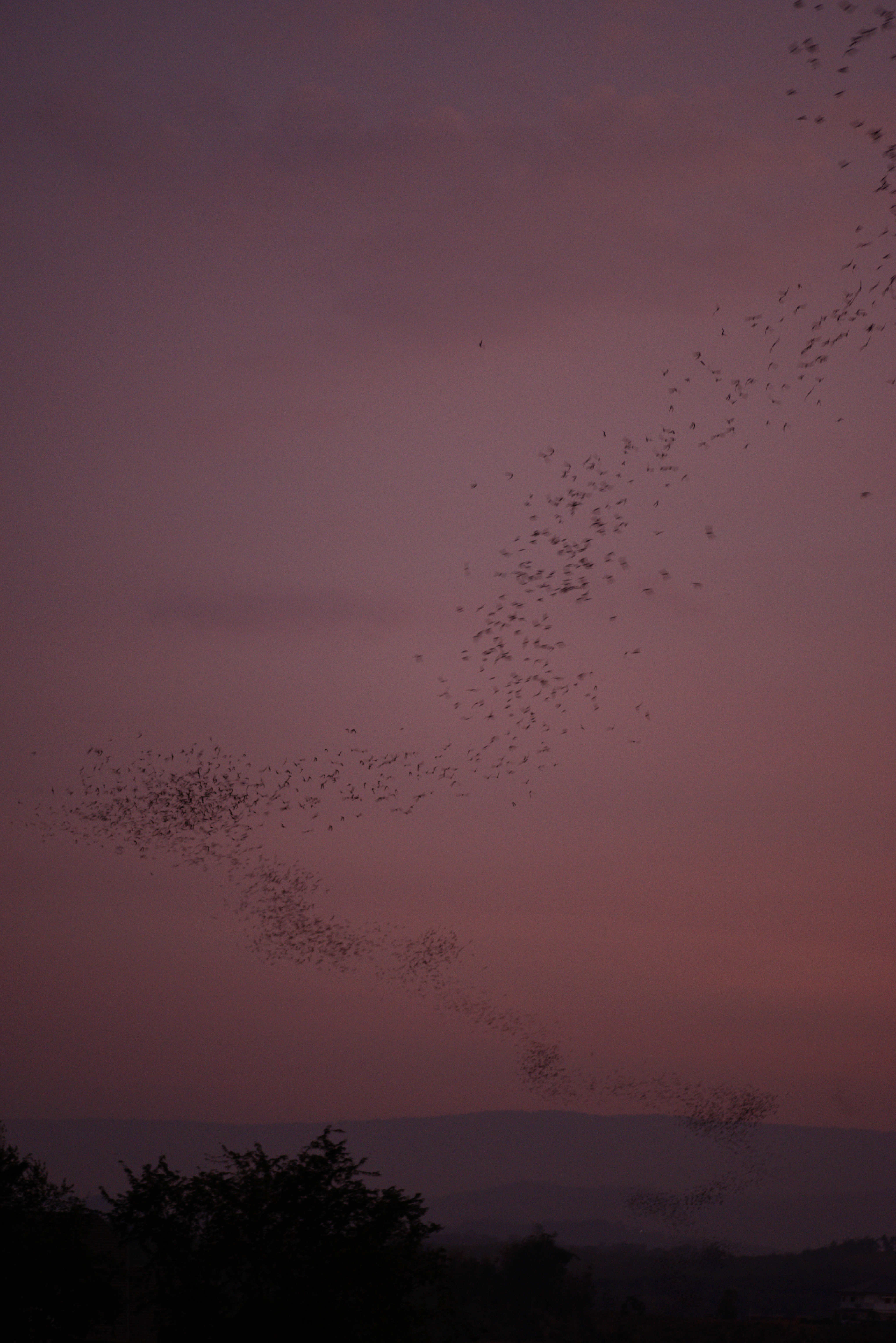 Den restlichen Tag genossen wir die kleinen Spaziergänge durch den Bambuswald und die Ausblicke, die sich an einer Klippe des Berges und von einem Aussichtsturm boten. Bei einem der Spaziergänge traten wir fast auf eine Schlange, die wie ein Stock über dem Weg lag und nur daran zu erkennen war, dass der Stock plötzlich etwas dünner wurde. Sie floh aber recht schnell auf einen Baum. Kurz nach 17 Uhr machten wir uns dann auf den Weg zu einer Fledermaushöhle, um den Ausflug von mehreren Millionen Tieren bei Sonnenuntergang zu beobachten. Wir erreichten die Stelle, die bei Google Maps eingezeichnet war über eine sehr holperige kleine Straße. Allerdings war der Platz nicht ideal, da die Sicht durch Bäume stark eingeschränkt war. Unser Fahrer kannte jedoch eine andere Höhle und tat sein möglichstes, um uns noch rechtzeitig dorthin zu bringen. Und tatsächlich kamen wir gerade rechtzeitig auf einem Feld an, auf dem sich bereits einige andere Schaulustige eingefunden hatten, um den Beginn des Ausflugs der Fledermäuse beobachten zu können. Erst kamen nur ein paar kleinere Schwärme heraus, dann zogen sich zwei breite Bänder über den allmählich dunkler werdenden Abendhimmel. Auch als es schon so dunkel war, dass man schon fast nichts mehr erkennen konnte, brach der Schwarm nicht ab. Es müssen etliche Millionen Tiere sein, die hier jeden Abend in diesem ununterbrochenen Schwarm ausfliegen und Jagt auf Insekten machen. Natürlich wissen das auch die Raubvögel, die immer mal wieder in den Schwarm hineintauchten und eine der Fledermäuse fingen.