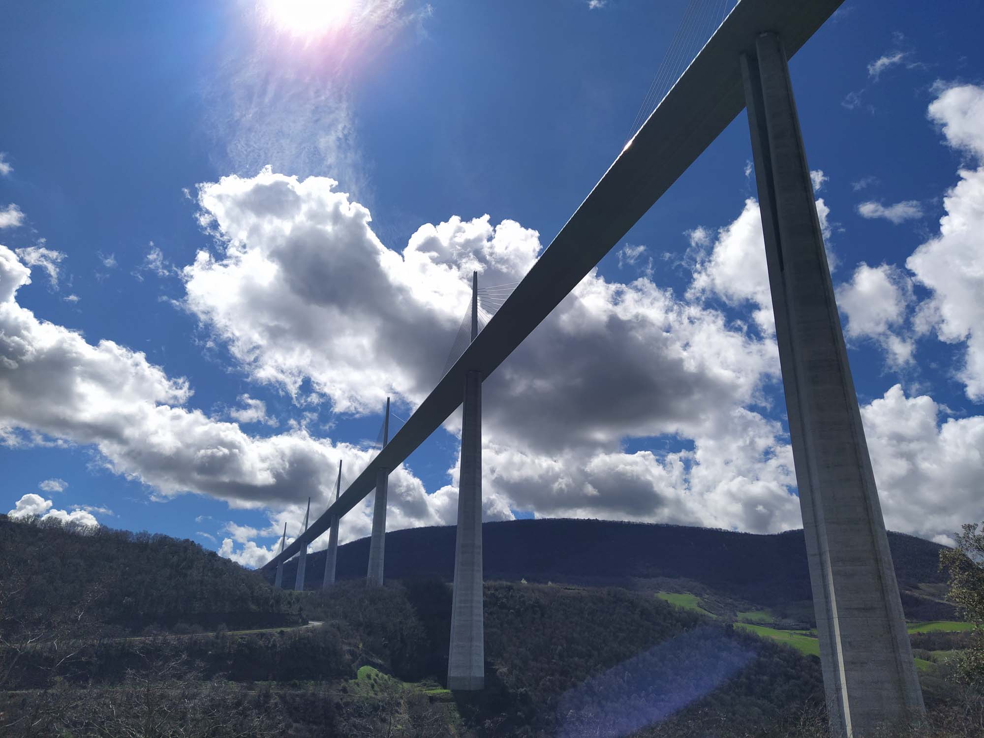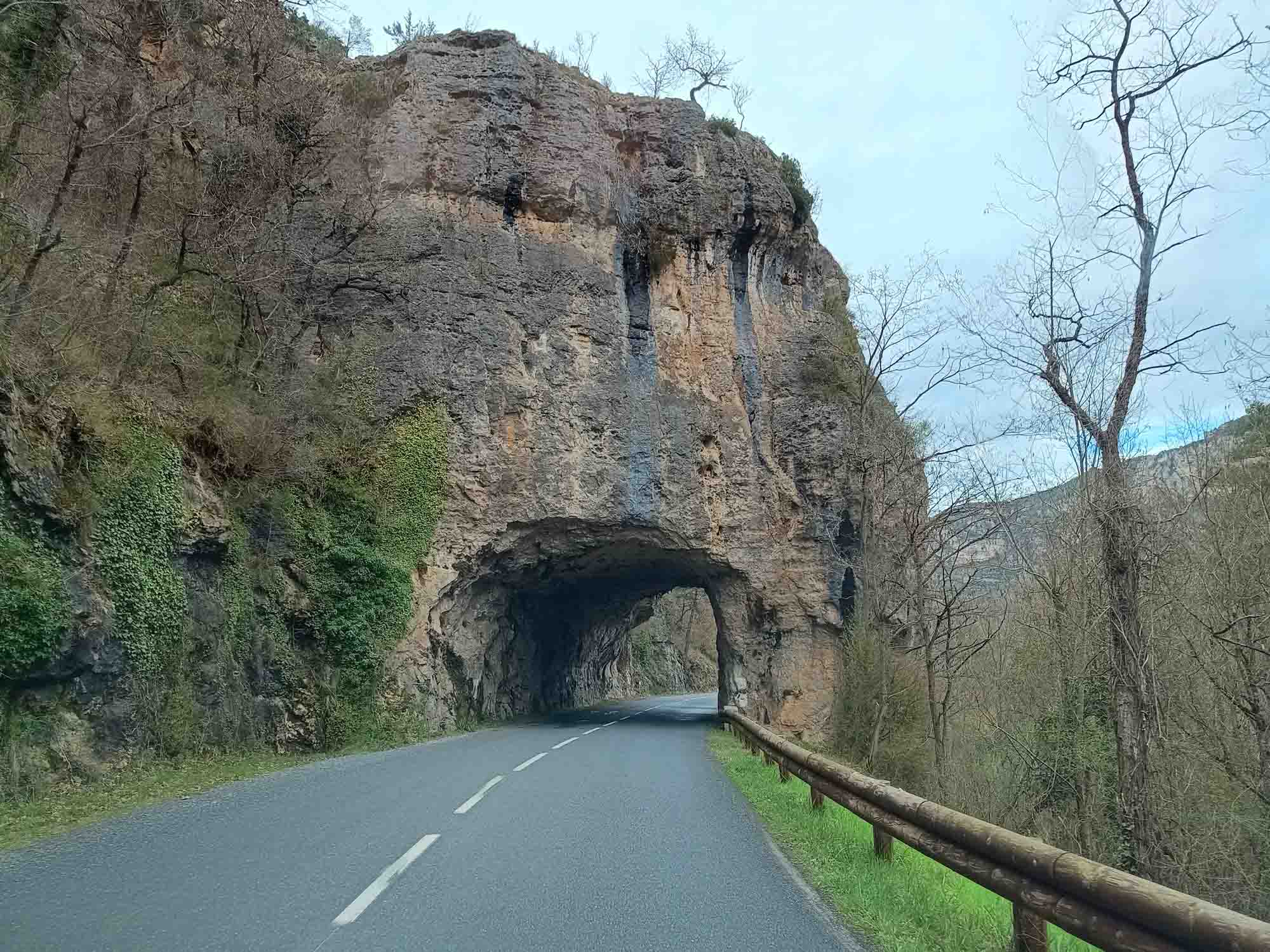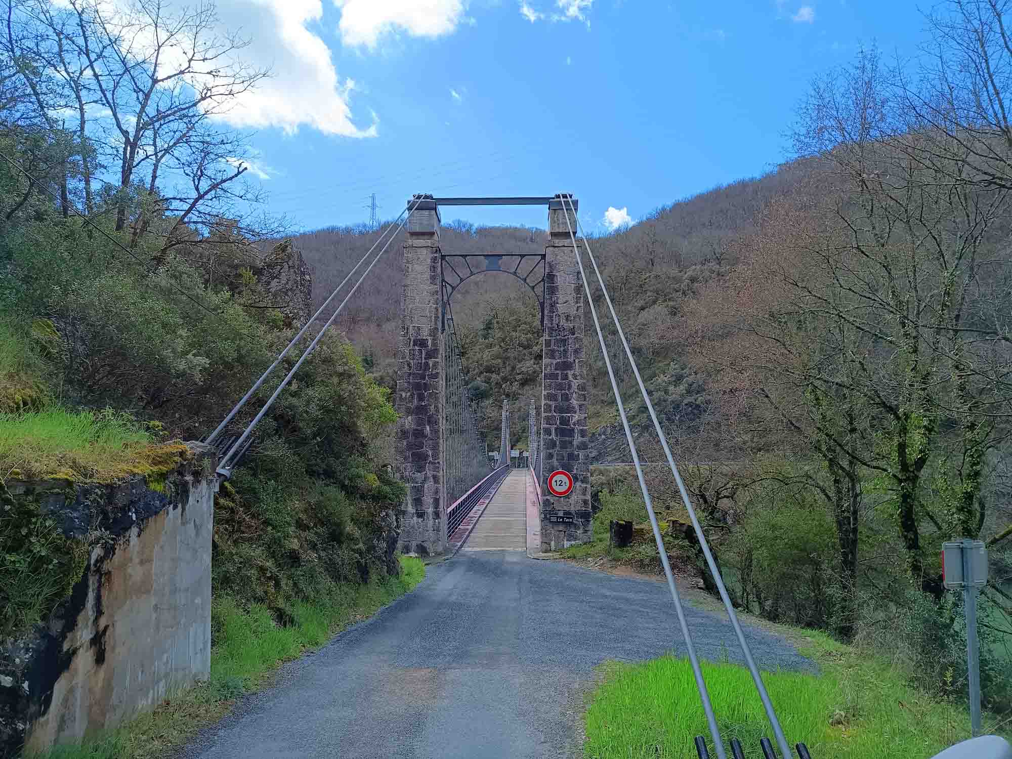 In der Nacht hatte es aufgehört zu regnen. Den Morgenspaziergang konnten wir wieder bei Sonnenschein machen. Wir schauten uns den Staudamm des Sees an, an dessen Ufer wir übernachtet hatten. Der See selbst war ziemlich leer und es standen zwei Angler am entgegengesetzem Ufer die versuchten, die letzten Fischer herauszuziehen. Der Stausee selbst diente als großer Speicher. An der Staumauer stand ein Pumpwerk, dass überschüssige Energie im Stromnetz nutzt, um Wasser in den See zu pumpen, das dann bei Energiebedarft rückwärts durch die Turbinen geleitet wird. Auf die dabei entstehenden Strudel wurde mit großen Warnschildern aufmerksam gemacht. Jegliches Schwimmen oder befahren des Sees war ausdrücklich verboten. Berta war heute beim Losfahren sichtlich entspannt und wir fuhren immer dem Flußlauf des Tarn folgend bis nach Millau. Dort schauten wir uns das gewaltige moderne Viadukt von Millau an, eine Autobahnbrücke, dessen Architekt Norman Foster war. Wir stellten uns vor, wie es wohl von oben aussehen musste und waren irgendwie doch froh unten zu sein. Anschließend fuhren wir mal wieder Einkaufen. Nicht allzu viel, da unser Kühlschrank nachts ja nicht mehr funktionierte. Danach ging es weiter dem Tarn flußaufwärts folgend durch die gleichnamige Schlucht. Die kleine Straße schlängelte sich wunderbar am Flußufer entlang, teils durch kleine Tunnel aber immer schön kurvig. Hin und wieder kam ein kleines Dörfchen. Unterwegs legten wir natürlich wieder eine kleine Kaffepause ein. Danach war es nicht mehr weit bis zu unserem Stellplatz. Dieser lag 3 km vom Tarn entfernt 800 m hoch in den Bergen der Cevennes. Es war diesmal sogar ein regulärer Platz. Bis auf das Wohnmobilschild gab es jedoch nichts besonders. Während unseres Spaziergangs sahen wir noch etliche Stellen mit Schnee, der allerdings schon sehr feucht war und vermutlich nicht mehr lange halten wird. Es sei denn, die Wetterprognose mit Neuschnee heute Nacht stimmt. Wir waren schon gespannt, wie es am nächsten Morgen aussehen wird.