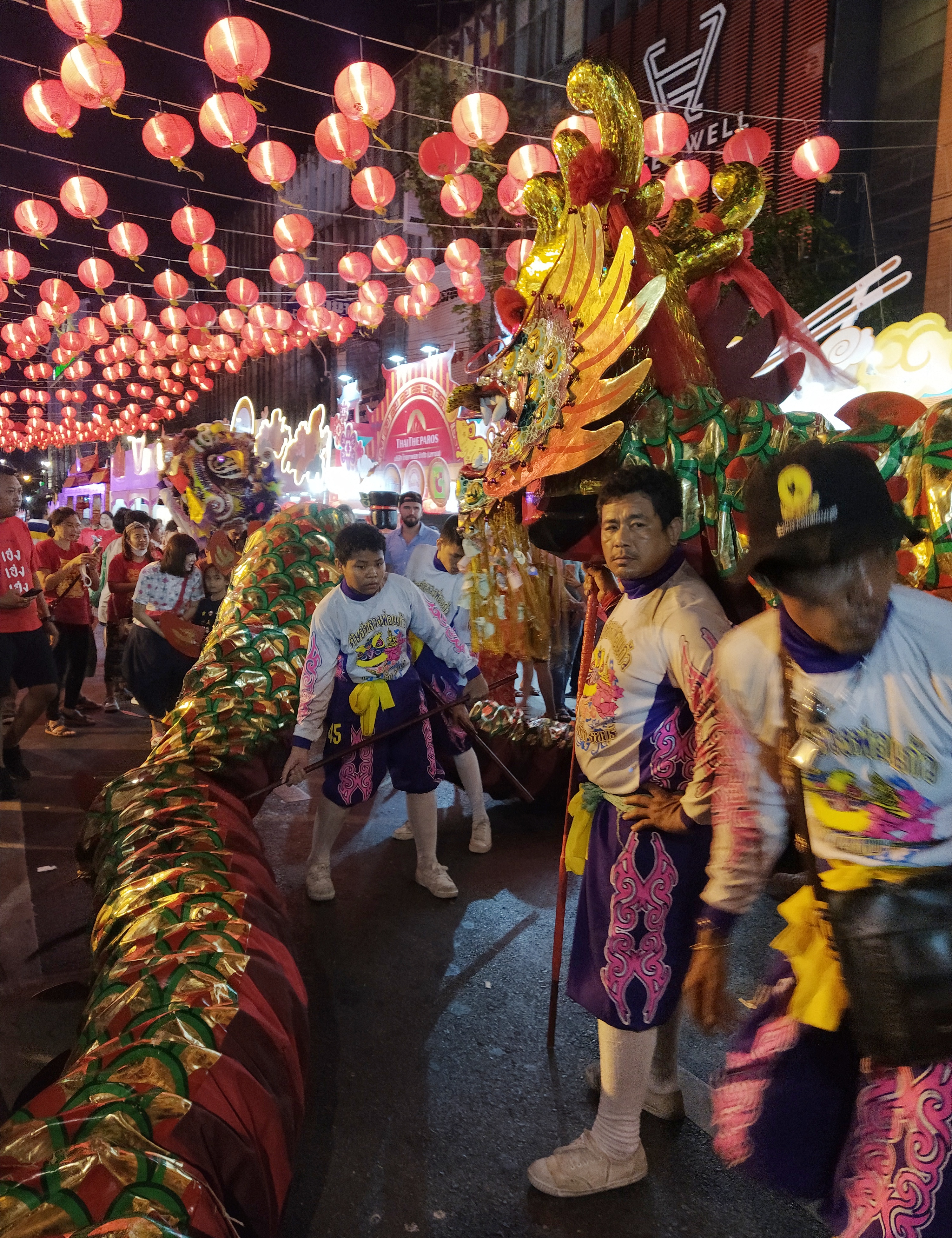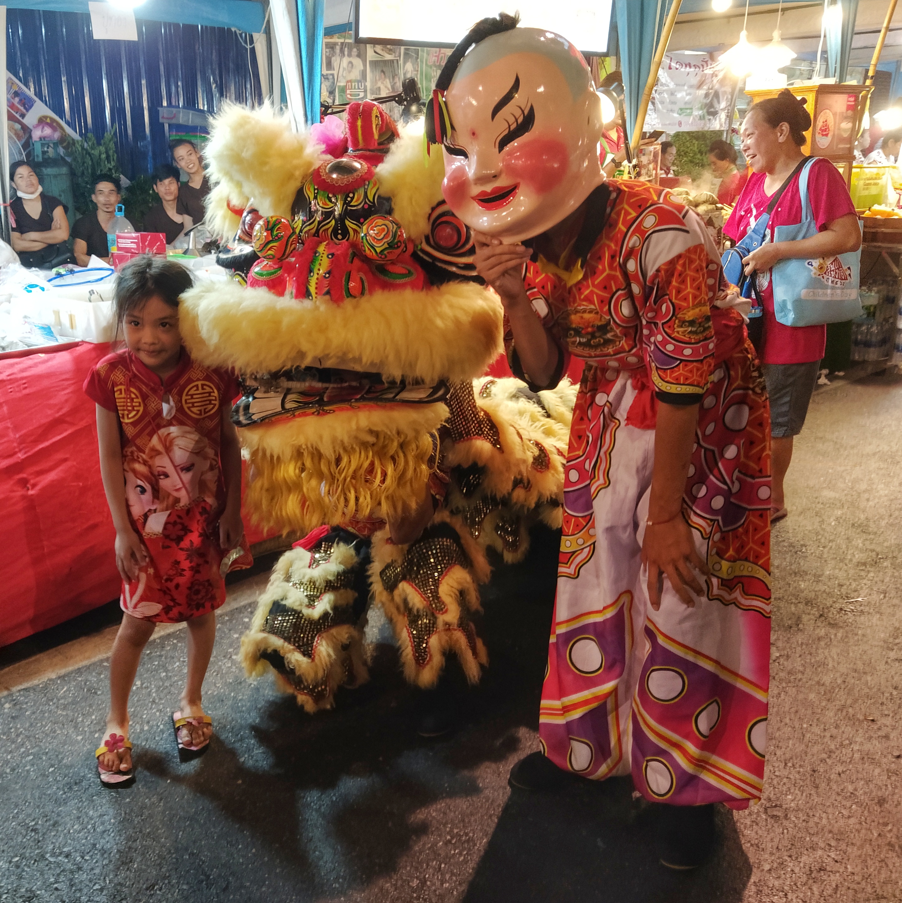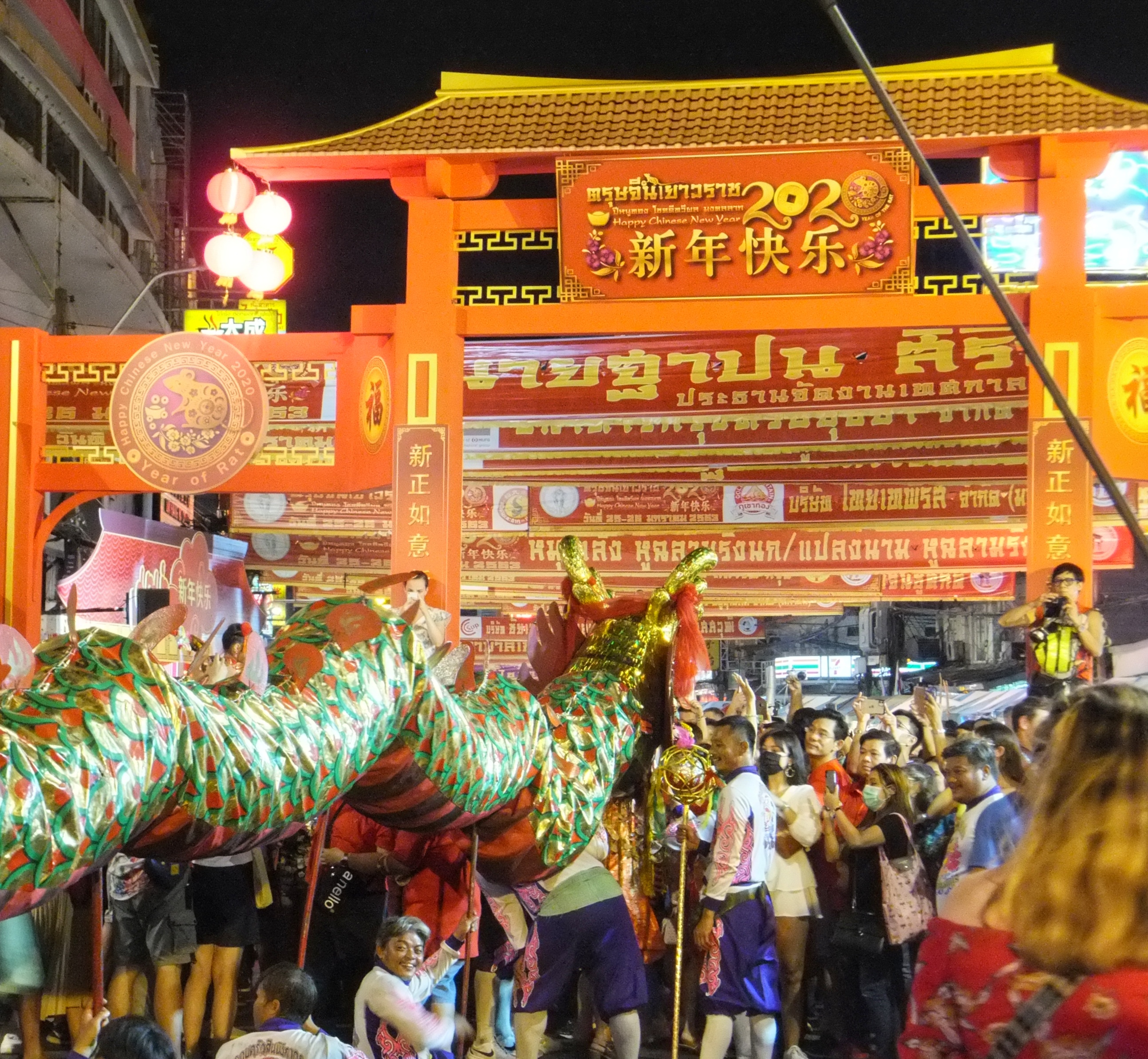 Pünktlich um 12:00 Uhr holte uns der Tuk-Tuk-Fahrer ab, der uns vorgestern nach Hause gebracht hatte. Die Wartezeit am Bahnhof überbrückten wir mit einer Nudelsuppe im nahegelegenen Einkaufszentrum. Die 3-stündige Bahnfahrt zurück nach Bangkok war sehr kurzweilig und beinahe hätten wir unsere Station verpasst. Eigentlich wollten wir einen Bus zum Hotel nehmen doch der kam auch nach 40 Minuten warten nicht. An der Haltestelle unterhielten wir uns mit einem Einheimischen, der an der Endstation des Busses wohnte, den wir ebenfalls nehmen wollten. Auch er war des Wartens leid und lud uns freundlicherweise ein, mit ihm das Taxi zu nehmen. Unterwegs erzählte er uns dann auch noch etwas über die verschiedenen Sehenswürdigkeiten entlang des Weges. Den Versuch uns an der Taxifahrt zu beteiligen, lehnte er entschieden lächelnd ab und so verabschiedeten wir uns herzlich. Nachdem wir uns frisch gemacht hatten – in Bangkok waren es ca. 33 Grad – fuhren wir mit dem Bus nach Chinatown. Schließlich war heute chinesisches Neujahr und in Bangkok sollte es eine große Festmeile geben. Nachdem wir uns durch die Menschenansammlung gekämpft hatten, die auf die Ankunft der Schwester des Königs warteten, bekamen wir auch das typische Spektakel geboten: Den tanzenden feuerspeienden Drachen. Dazu ein kleines Feuerwerk. Nach einer kleinen Pause zeigten uns die Drachentänzer, dass sie auch gute Artisten sind: Spontan bildeten sie einen Turm, wobei jeder dem anderen auf den Kopf stieg. Ansonsten war das Fest vergleichbar mit dem vor ein paar Tagen. Nur dass noch viel mehr Menschen unterwegs waren. Wir genossen die Party und blieben länger als wir eigentlich vor hatten. Der Bus, den wir zurück nehmen wollten fuhr nicht mehr wie wir feststellen als wir entlang der Busroute nach Hause spazierten. Immer wieder versuchten wir ein Taxi anzuhalten, aber die aufgerufenen Preise waren entweder unverschämt hoch oder der Fahrer wollte nicht dorthin fahren. Aber irgendwann klappte es dann doch. Nur das der Fahrer diesmal behauptete, das Hotel zu kennen uns dann aber doch woanders hinfuhr. Gut, dass wir uns inzwischen recht gut in Bangkok auskannten. Wir bezahlten die Fahrt bis dahin nach Taxameter (also etwas weniger als ursprünglich vereinbart) und gingen die restlichen 5 Minuten zu Fuß.
