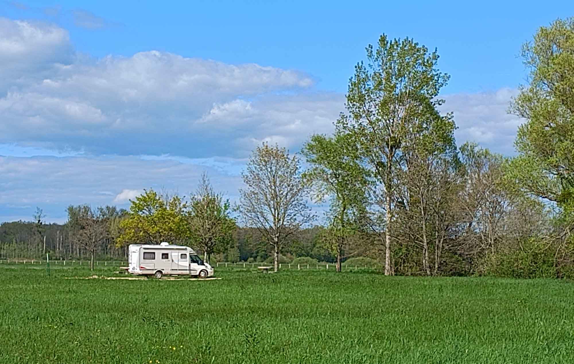 Der Morgenspaziergang durch das Dorf wurde rüde durch lautes Hundegebell unterbrochen. Wir wollten es lieber nicht auf die Spitze treiben und kehrten nach wenigen 100 Metern wieder um. Danach wurden die Hunde auch schnell wieder ruhig. Berta hatte nach zwei Fahrtagen in Folge auch keine Lust weiterzufahren. Sie legte sich unter einen Picknicktisch und machte es sich dort gemütlich. Selbst als wir kurz den Motor anließen rührte sie sich nicht vom Fleck. Aber als wir dann losfuhren, schaute sie erst ein bisschen hinterher, stand dann auf und rannte wie der Blitz hinter uns her. Natürlich hielten wir gleich wieder an und sie sprang bereitwillig. Auch wenn sie noch immer keine große Lust zum Fahren hatte war es ihr wohl doch lieber, bei uns zu bleiben. Nach einer halben Stunde fanden wir bei Navilly einen tollen Platz im Grünen am Fluß Doubs. Dort machten wir einen schönen Spaziergang am Fluß entlang, bis wir am Ende an einem Zaun standen und nicht mehr weiterkamen. Anschließend verlängerten wir die Pause mit einem Kaffee und mit Spielen, so dass Berta noch einmal schlafen konnten. Danach hatten wir noch eine Stunde, bis wir einen absolut fantastischen Platz im Nirgendwo erreichten. Hier waren wir sicher, dass sich niemand zu uns gesellen würde. Der Platz lag unmittelbar am Bach Vingeanne in der Nähe des Örtchens Fontaine-Française, ca. 30 km nordöstlich von Djon. Der befestigte Platz lag direkt an einem Bach, der extrem viel Wasser führte und hatte einen Durchmesser von ca. 10 m. Durch das viele Wasser im Bach hatten sich beidseits kleine Seen auf den Wiesen gebildet, die durch eine Furt über den Zufahrtsweg zu unserem Platz verbunden waren. Abgeschiedener hatten wir es selten. Allerdings waren Spaziergänge zunächst auf die 10 m innerhalb unseres Platzes beschränkt. Zumindest solange, bis wir die Steine und die Äste entdeckten, mit denen wir uns eine Behelfsbrücke über das Wasser konstruierten und dann doch einen ausgiebigen Spaziergang zur nahegelegenen Schleuse No. 32 und entlang des dazugehörigen Canal Entre Champagne et Bourgogne. So bekam Berta dann doch noch etwas mehr Bewegung nach den letzten anstrengenden Tagen. Danach gab es für sie schon etwas zu essen und dann konnte sie endlich erschöpft aber wieder zufrieden einschlafen. Wir verbrachten den Rest des Tages wieder mal mit Spielen und freuten uns auf die nächsten Tage, an denen es wieder wärmer werden sollte.