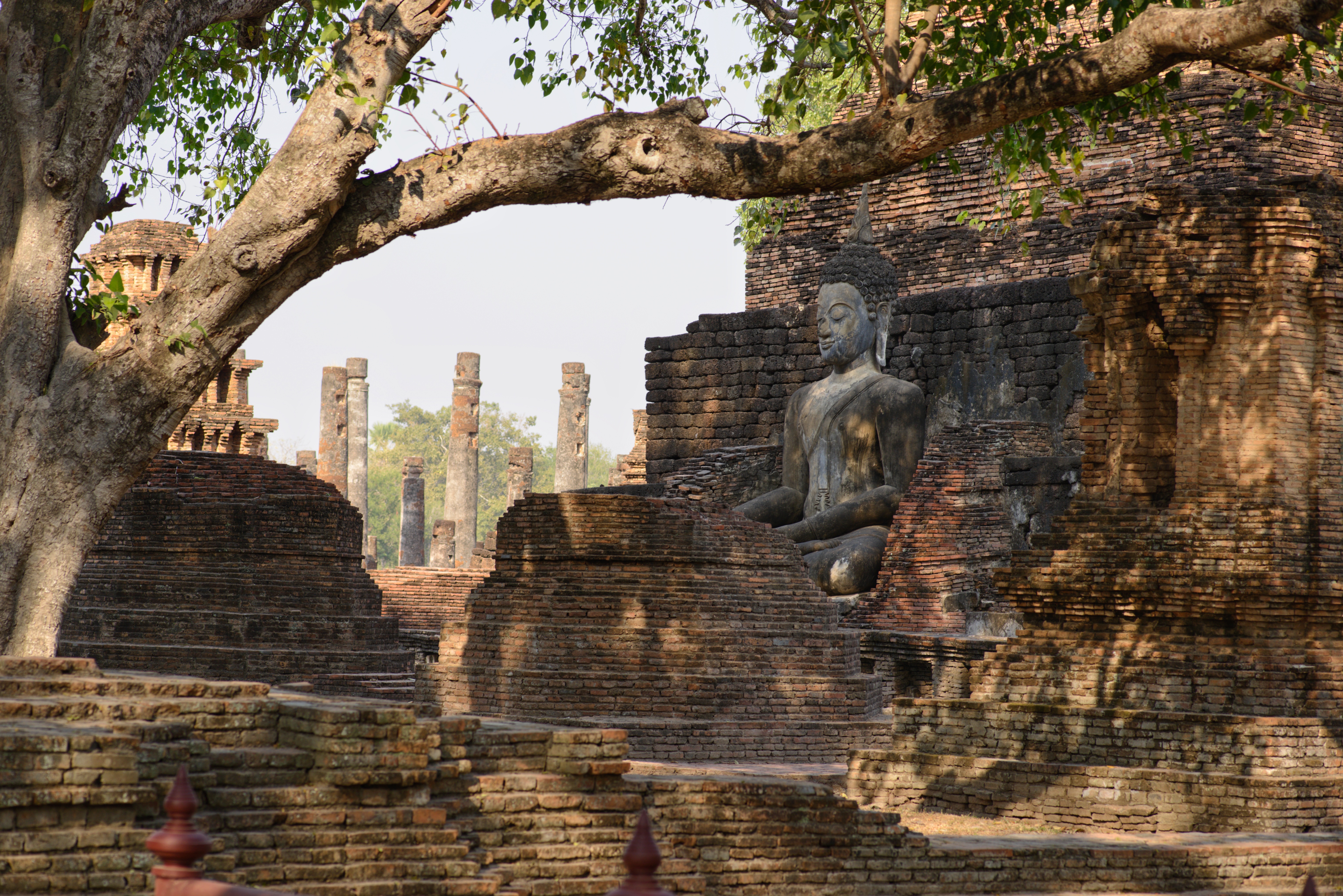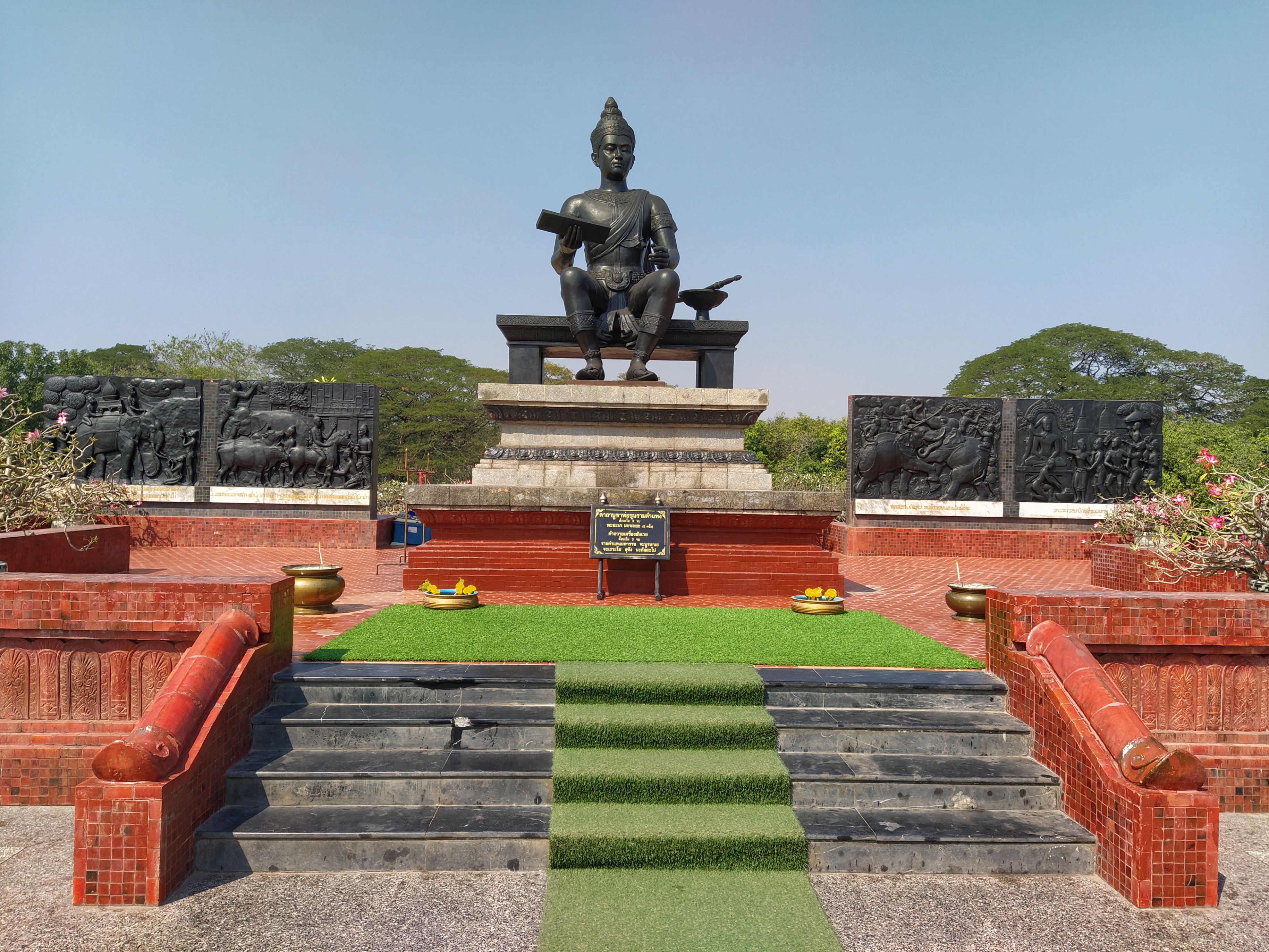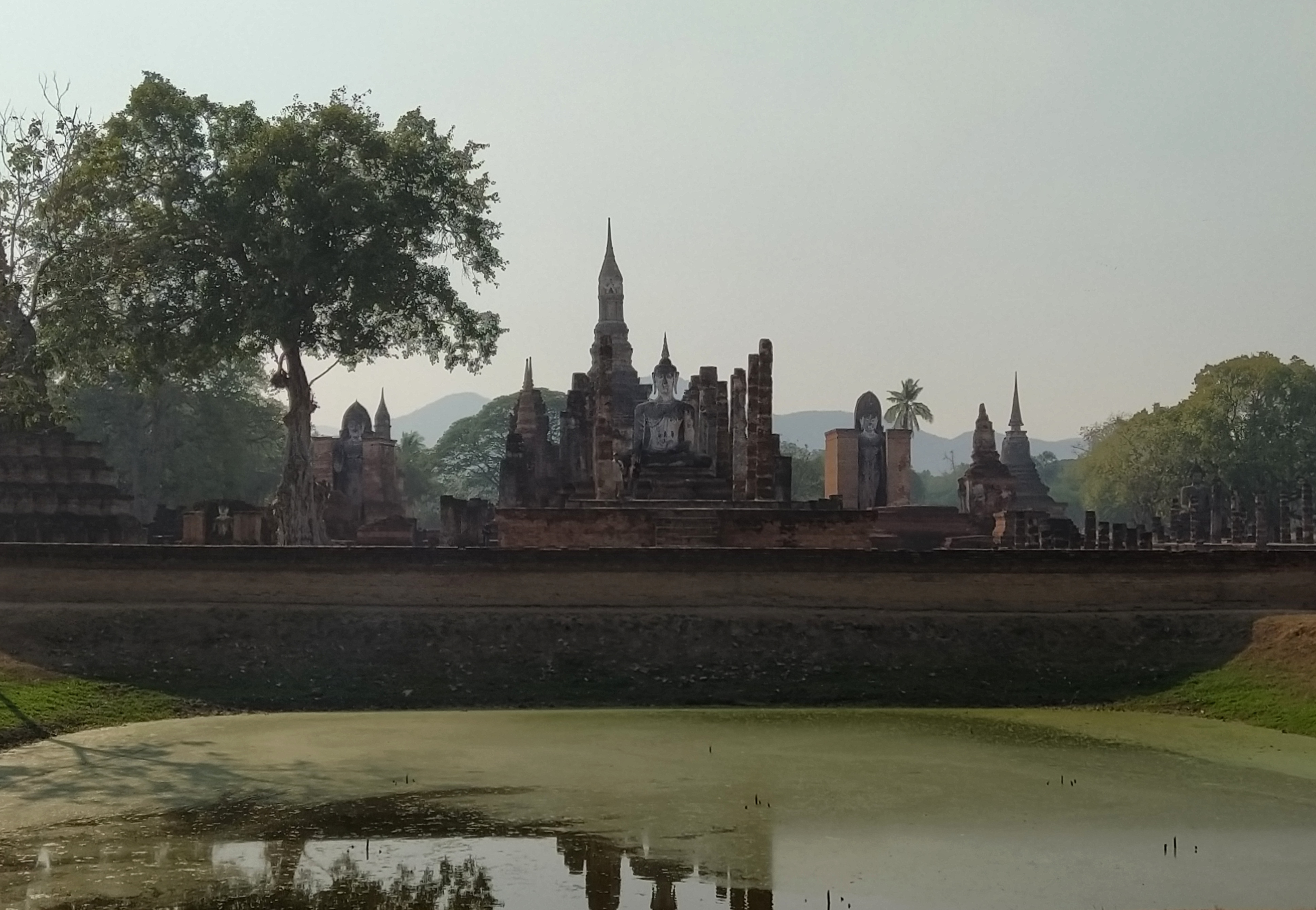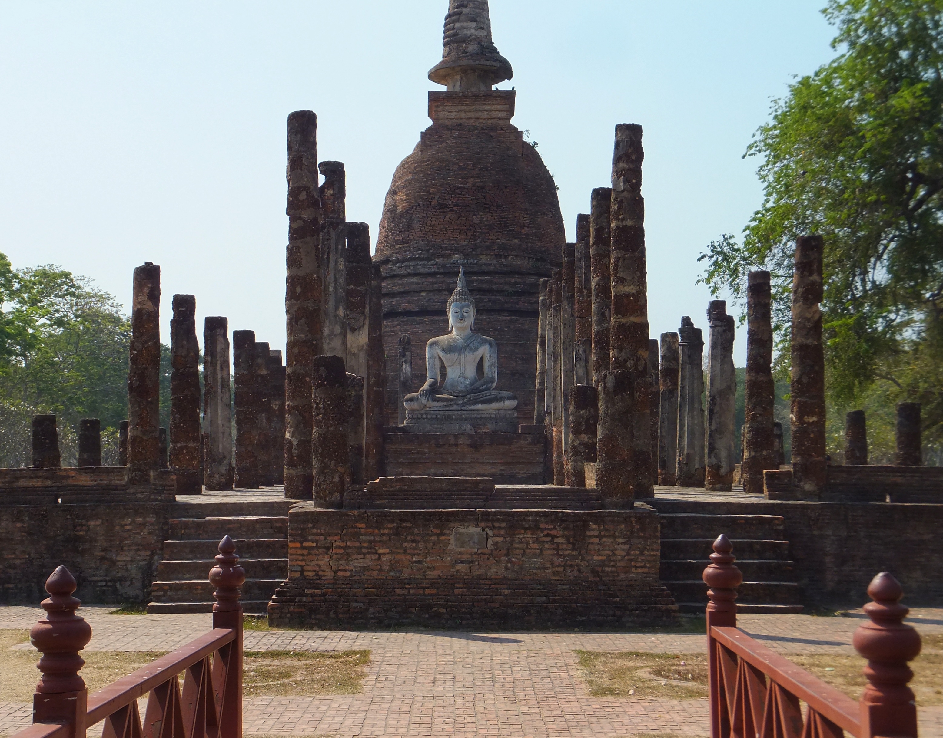 Nachdem wir ausgeschlafen hatten, machten wir uns gegen Mittag auf, den Historical Park von Sukhothai zu besichtigen. Unser Hotel lag leider in der Neustadt und so nahmen wir für 30 Baht je Person den Bus für die 14 km zur Altstadt. Für noch einmal 30 Baht liehen wir uns Fahrräder und erkundeten damit die schön angelegte Parkanlage. Die Ruinen der ersten Hauptstadt Thailands waren zwar weniger gut erhalten. Aber die ruhige Lage und die Möglichkeit durch den fast menschenleeren Park mit dem Fahrrad zu fahren, machten es zu einem sehr schönen Erlebnis. Zum Abschluss fuhren wir noch zu einem Tempel, der vollständig mit Wasser umgeben war. Auf den Holzbrücken, die hinüberführen, stehen morgens um 5:30 Uhr die Bettelmönche, um sich versorgen zu lassen. Mit dem Bus ging es zurück zur Neustadt wo wir nach einem kleinen Spaziergang zu Abend aßen.