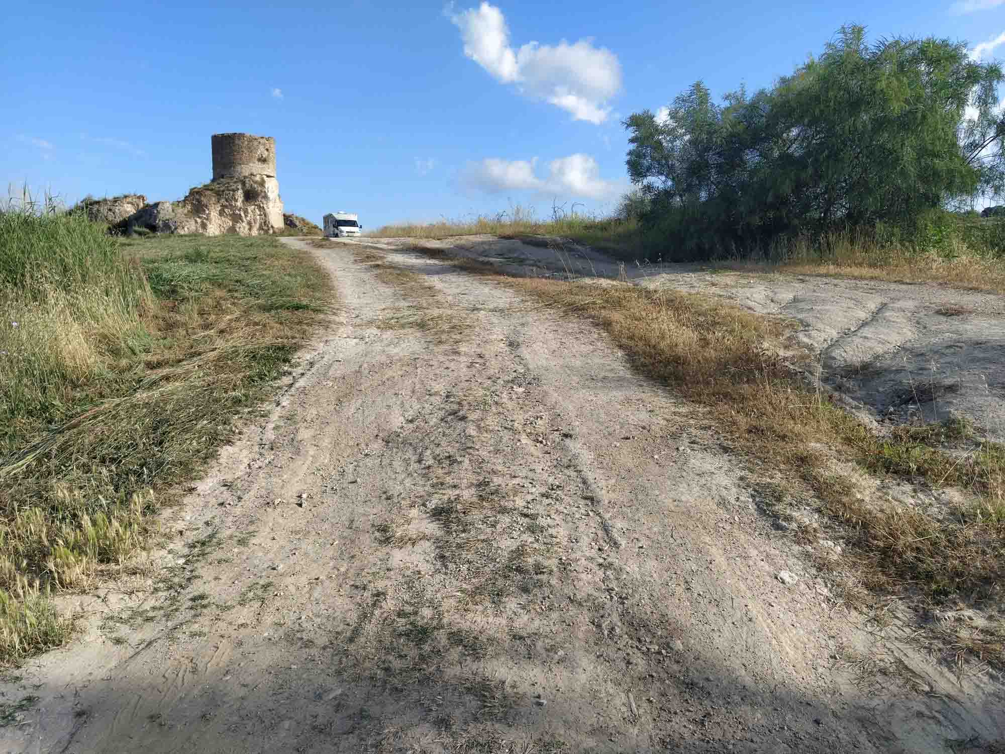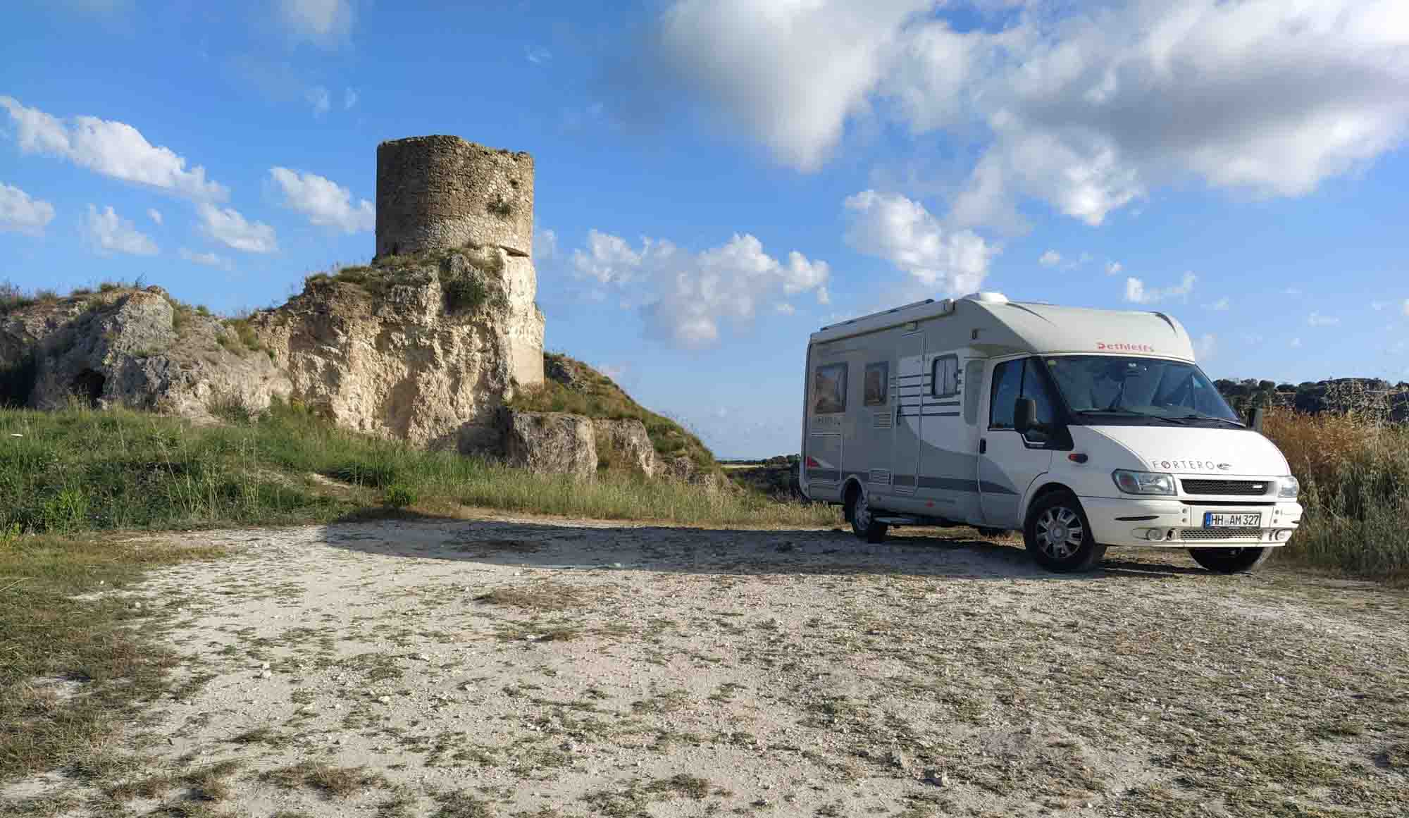 Die Nacht war wieder herrlich ungestört und ruhig. Der Morgen begann sonnig und es versprach wieder sehr heiß zu werden. Nach dem frühen Spaziergang ließen wir wieder alles auf und ließen den Tag gemütlich an uns vorrüber ziehen. Bis auf ein paar Gelegentliche Besucher des Turms blieben wir völlig ungestört. Am späten Nachmittag gingen wir noch eine Runde spazieren und machten uns dann abfahrbereit. Es war eindeutig ein Kompromiss. Früh genug, um die 20 Uhr Fähre sicher zu erreichen (die nächste würde erst um 21:40 Uhr abfahren) aber spät genug, dass es sich schon ein wenig abgekühlt hatte. Um 16:30 fuhren wir los und wir kamen noch ganz schön ins Schwitzen. Die Klimaanlage brauchte noch ziemlich lange, bis sie das Auto auf ein erträgliches Maß heruntergekühlt hatte. Wir fuhren gemütlich immer entlang der Küste bis nach Villa San Giovanni, wo die Fähre nach Sizilien abfahren würde. Berta saß erstmals auf der Reise auf dem Beifahrersitz und schaute mal interessiert nach draußen und mal legte sie sich auch einfach nur hin. Wir kamen gut durch und nachdem wir es auch geschafft hatten, am Self-Service ein Ticket zu kaufen, fuhren wir in die Warteschlange zur Fähre. Die war jedoch leer, so dass wir sofort bis nach vorne fahren konnten, wo unser Ticket gescannt wurde. Dann ging es sofort weiter auf die Fähre, die Tore schlossen sich und es ging los. Wir hatten gerade noch die 19:20 Uhr Fähre bekommen. Keine Wartezeit. Perfekt. 20 Minuten später waren wir in Messina auf Sizilien. Zumindest fast. Denn erst mussten wir den Hafen wieder verlassen, was sich aufgrund der vielen Autos vor uns etwas verzögerte. Der Stau setzte sich dann auch auf der Fahrt durch Messina fort, wobei Stau natürlich nicht für alle galt. Nicht nur, dass wie üblich die Motorräder und Mopeds rechts und links überholten, auch der eine oder andere Autofahrer hatte es eilig und quetschte sich irgendwie durch. Als wir durch die Stadt endlich durch waren wurde es dunkel und es begann auch noch zu regnen. So tasteten wir uns an den meisten Schlaglöchern vorbei, durch enge Dörfer und reichlich Gegenverkehr. Bis wir nach 40 km zu unserem Abzweig in der Berge kamen. Wir kannten den Platz im ausgetrockneten Flussbetts des Fiomara d'Agro schon aber die enge kurvige Straße in der Nacht hinaufzufahren war dann doch anspruchsvoller, als wir uns das gewünscht hätten. Am Ende war es schon 21:30 Uhr als wir endlich unser schönes einsames Plätzchen im Flussbett erreichten und wir uns Abendbrot machen konnten. Danach dauerte es auch nicht lange, bis wir beide müde und erschöpft einschliefen.