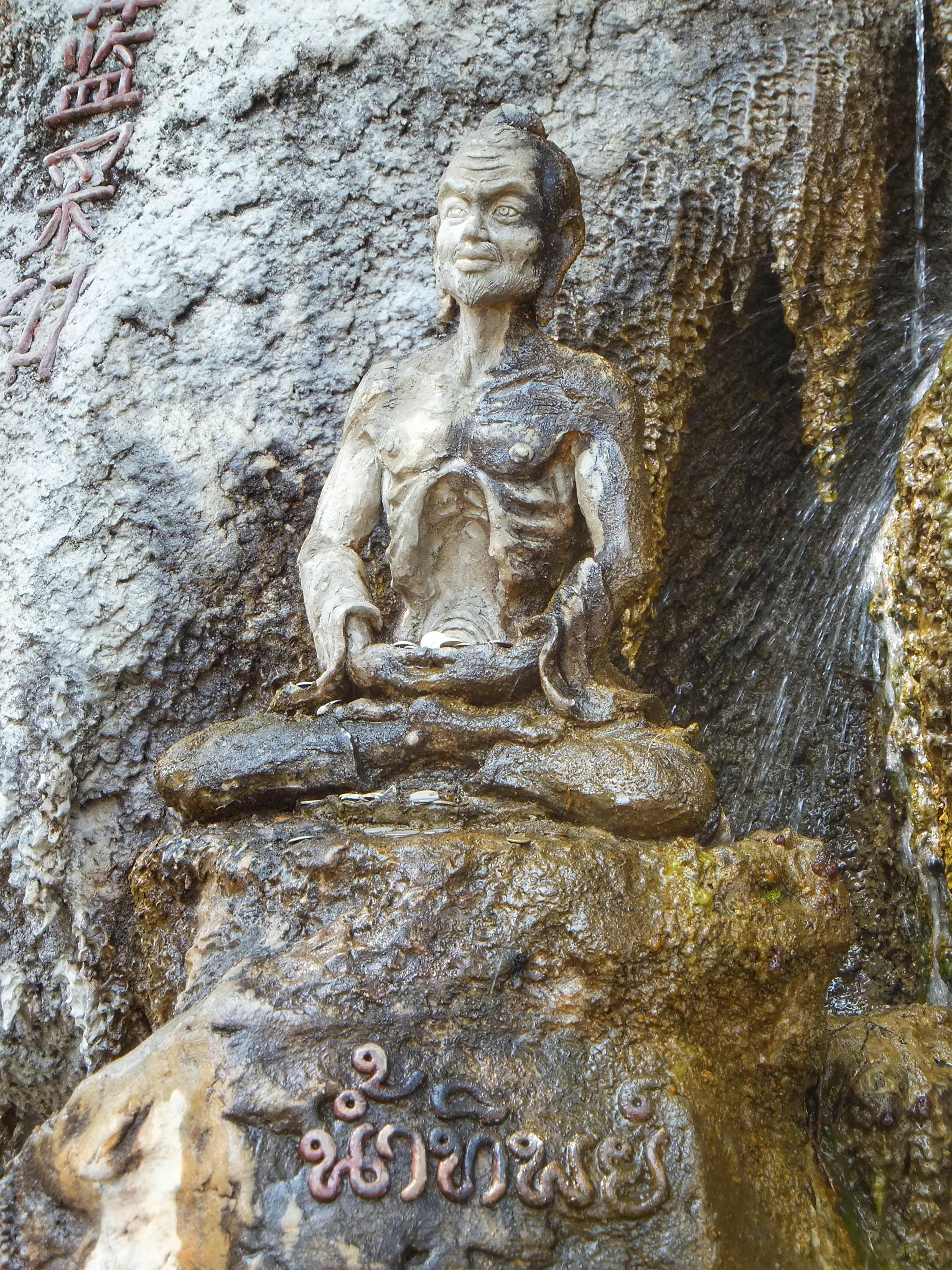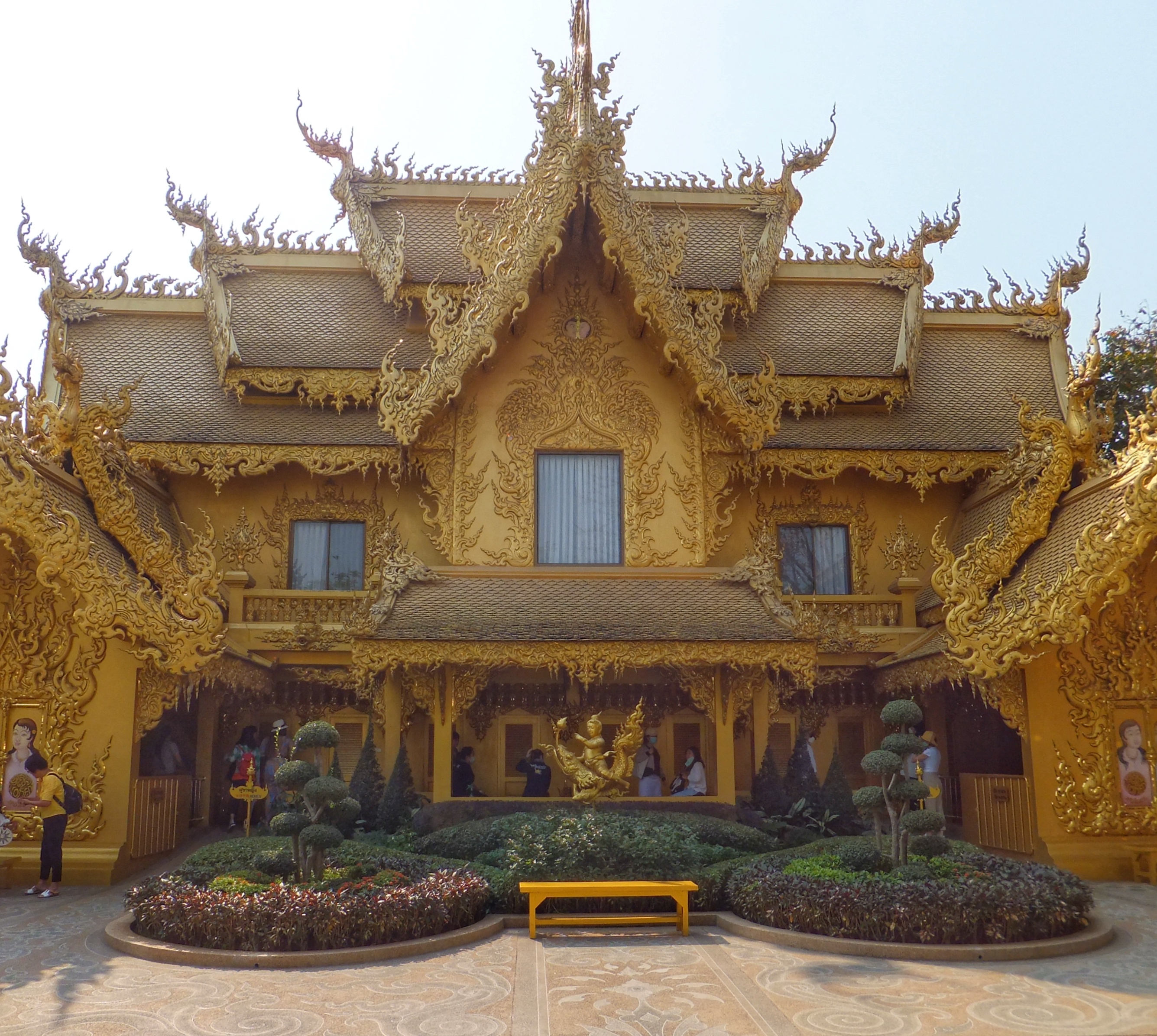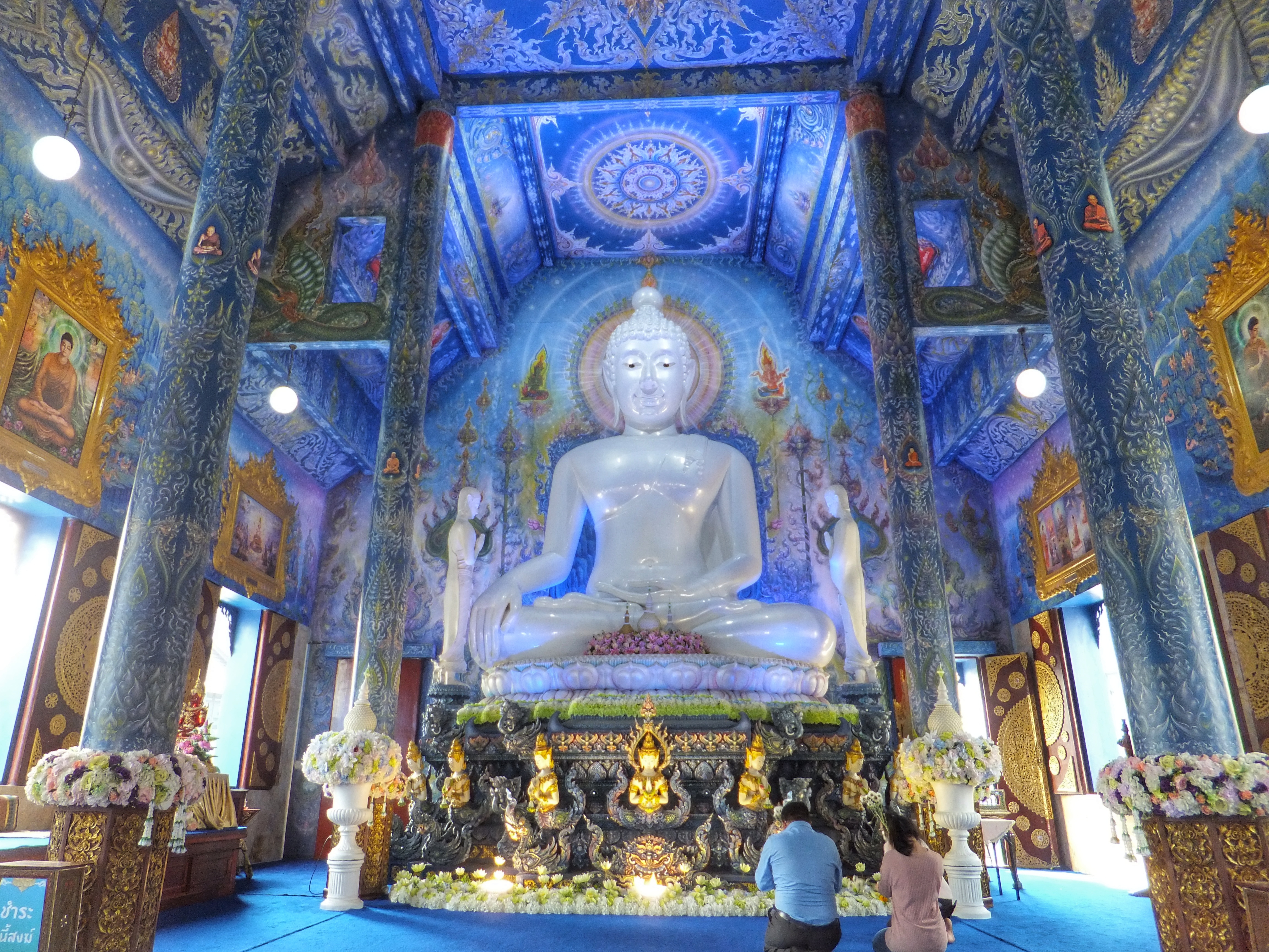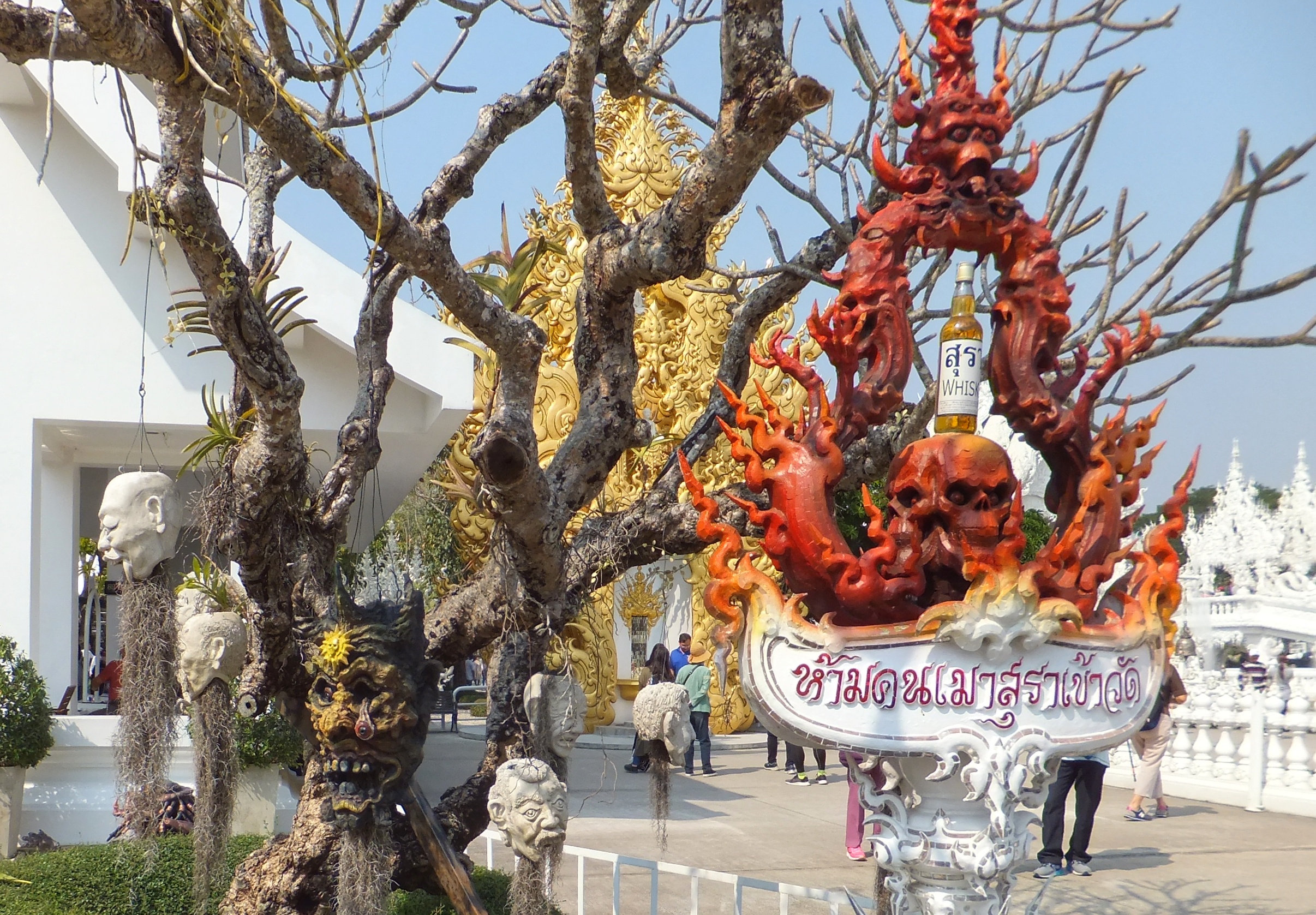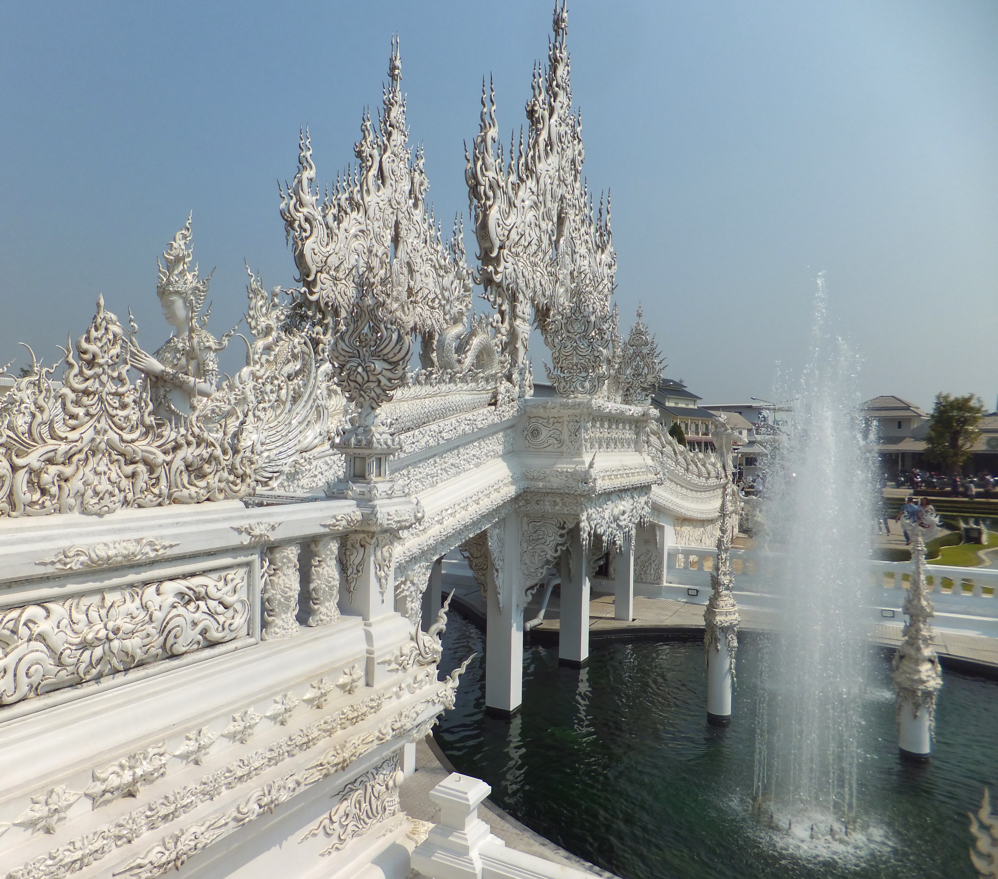 Wie immer pünktlich wurden wir um kurz nach 7:00 Uhr im Hotel abgeholt. Nachdem die anderen Gäste ebenfalls eingesammelt worden sind, fuhren wir mit einem kurzen Stopp nach Mae Kachan Hot Spring and Geyser, bestaunten das Kochen von Eiern im 90 Grad heißen Wasser und ließen uns dann zum weißen Tempel nach Chiang Rai fahren. Die Fahrt war etwas abenteuerlich vor allem wegen der abrupten Fahrweise unseres jungen Fahrers. Unentwegt musste er an den unmöglichsten Stellen überholen, nur um dann hart zu bremsen und erneut kräftig zu beschleunigen. Um 11:00 Uhr waren wir in Chiang Rai angekommen. Die Gruppe hatte sagenhafte 40 Minuten an diesem atemberaubenden Tempel. Wir hatten mit dem Guide besprochen, wo er uns Abends wieder in Chiang Rai abholen sollte. So schauten wir uns den Tempel in aller Ruhe an, aßen hier noch ein kleines Mittagessen und blieben so etwas mehr als 4 Stunden hier. Dann ließen wir uns von einem Taxi zum blauen Tempel fahren und waren überrascht, dass uns auch dieser Tempel noch einmal beeindrucken konnte. Zur verabredeten Zeit fuhren wir wieder mit dem Taxi, kauften im Einkaufszentrum noch eine Kleinigkeit ein und dann ging es auch schon wieder die 3 Stunden zurück nach Chiang Mai. Die anderen taten uns ein bisschen mehr leid, hatten sie doch den ganzen Tag hauptsächlich im Minivan verbringen müssen. Etwas schlecht war uns trotzdem, als wir um 21:30 wieder im Hotel waren. Wir schlenderten noch über den nahegelegenen samstäglichen Nachtmarkt ehe wir dort noch zu Abend aßen und anschließend todmüde ins Bett fielen.