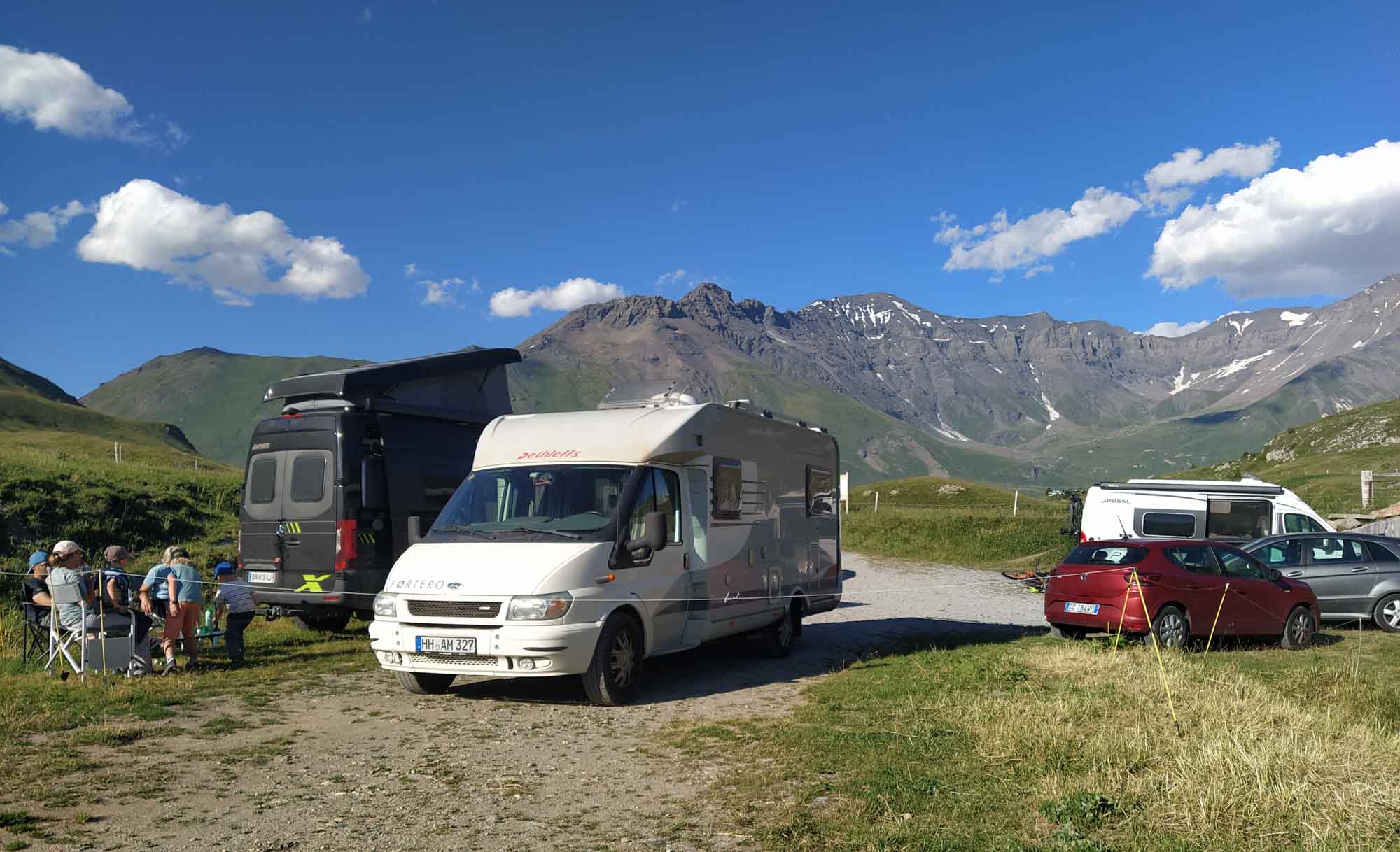 In der Nacht wachten wir auf, weil ungewöhnlich durch die offenen Fenster leuchtete. Als wir die Tür öffneten sahen wir ein sehr ungewöhnliches Gewitter. Unmittelbar vor uns lag eine große dunkle Wolke und die Blitze schienen sich von oben in diese Wolke zu entladen und erleuchteten dabei regelmäßig die Oberseite, was wir jedoch nur erahnen konnten, da die dunkle Wolke das meiste davon verdeckte. Und dabei war alles völlig geräuschlos. Nicht der kleinste Donner war zu hören. Danach gingen wir wieder ins Bett und schliefen bis morgens um 9 Uhr durch. Der Tag begann angenehm kühl. Aber wir hatten heute eine länge Strecke vor uns und machten und bereits um 10 Uhr auf den Weg. Anfangs ging es noch relativ langsam, als wir der schmalen Straße bergab folgten. Dann jedoch kamen wir auf immer größere Straßen und bald schon verließen wir die Berge. In der Umgebung von Turin fuhren wir durch flaches Land, in dem überwiegend Wein und Mais angebaut wurde. Kein Wunder, kamen wir doch durch die Region von Asti, dem Weinanbaugebiet des Piemont. Nachdem wir noch einmal eingekauft hatten, fuhren wir den Ausläufern der Alpen entgegen, die wir bereits von Turin aus sehen konnten. Das wurde auch Zeit, denn im Auto waren es mittlerweile trotz Klimaanlage 35 Grad. Die nachmittägliche Sonne schien unbarmherzig auf unser Dach und wir waren froh als in der Nähe der Berge ein paar Wolken aufzogen und hin und wieder etwas Schatten spendeten. Wir folgten dem Fluss Dora Riparia bis nach Susa, wo wir nach Norden abbogen und es schnell höher ging. Und endlich nahm auch die Temperatur im Wagen etwas ab. Nach endlos erscheinenden Serpentinen, die vor allem die vielen Motorradfahrer erfreuten, die die Strecke für einen Ausflug zum kühlenden See nutzten kamen wir am La du Mont-Cenis in 1.800 m Höhe an und waren wieder in Frankreich. Hier tummelten sich nicht nur die ganzen Motorradfahren, die uns überholt hatten, sondern auch etliche andere Ausflügler und zahlreiche Wohnmobilisten. Hoffentlich hatten sie für uns einen Platz übrig gelassen. Unseren avisierten Stellplatz erreichten wir mal wieder nicht. Die kleine Straße war mit großen Steinen blockiert und der Wer nunmehr nur noch für Radfahrer und Fußgänger passierbar. Aber am nordwestlichen Ende des Sees sollte es einen weiteren Zugang geben, den wir dann auch nutzten. Allerdings war die Straße nur noch einspurig und es kamen uns einige Fahrzeuge entgegen. Zum Glück gab es genügend Ausweichmöglichkeiten, so dass es immer irgendwie ging. Als wir einen kleinen Parkplatz mit einem freien Platz entdeckten, nutzen wir unsere Chance sofort, platzierten uns, holten unsere Stühle heraus und genossen ein herrlich erfrischendes Alsterwasser in der kühlen Bergluft. Kühl war es tatsächlich und es dauerte nicht lange, da wechselten wir unsere kurzen Sachen in lange Hosen. Nach einiger Zeit verzogen wir uns wieder nach drinnen, spielten noch etwas, machten uns ein herrliches Bauernfrühstück zum Abendbrot und nachdem wir erstmals alle Fenster verdunkelt hatten, verschwanden wir erschöpft von dem langen Tag im Bett, wo wir ganz schnell einschliefen.
