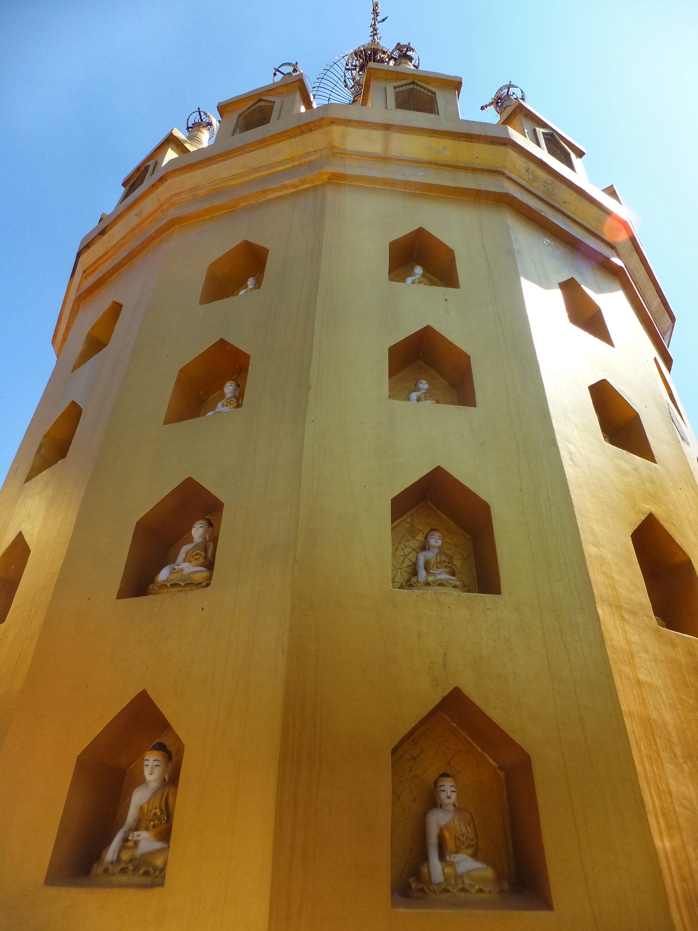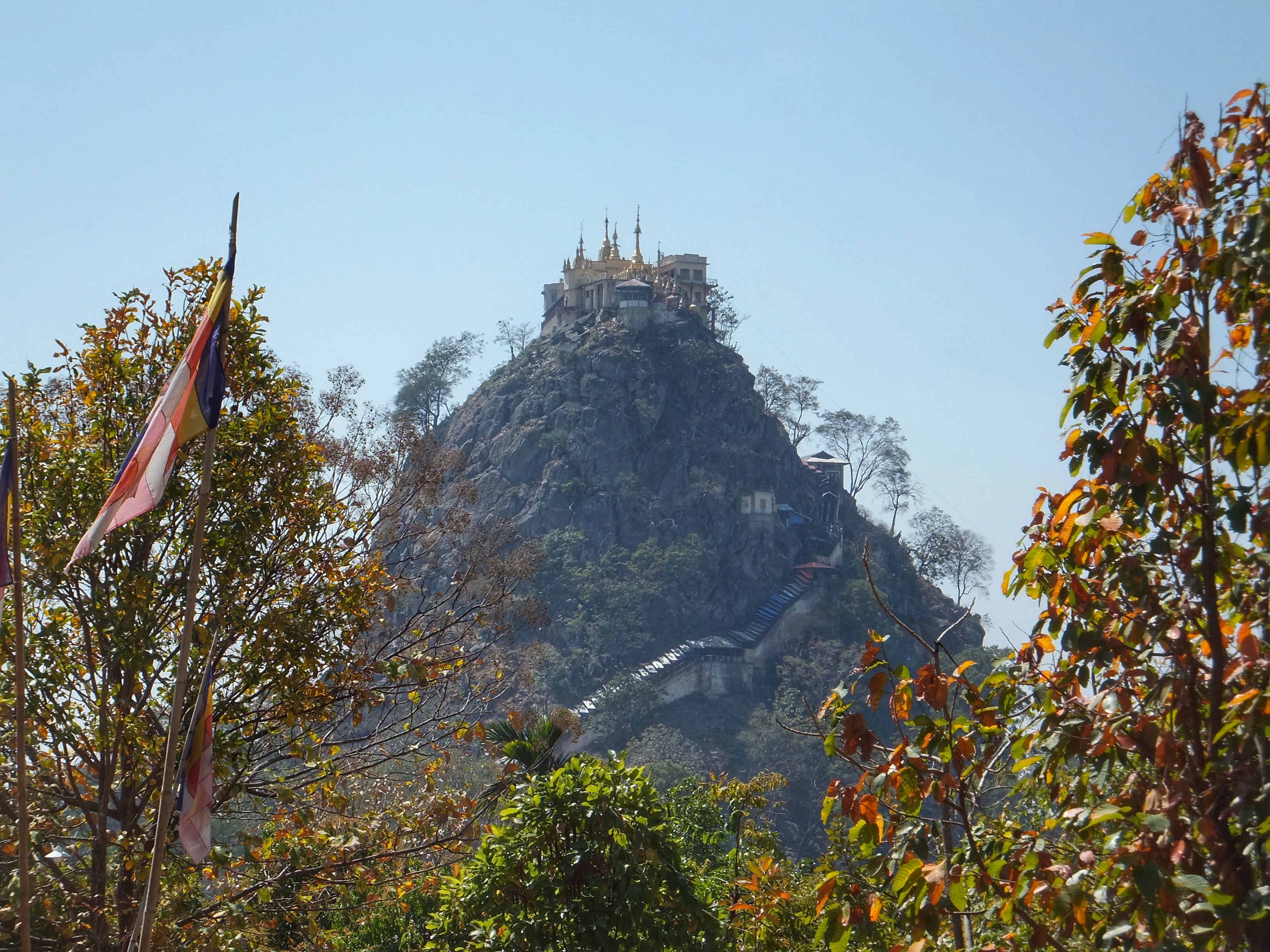 Mount Popa ist besonders aus der Ferne schön anzusehen. Die Tempelanlage thront auf einem einzelnd aus dem Gelände aufragenden steilen Berg. Der Aufstieg über 770 Stufen war schnell geschafft und – da wie kein Affenfutter gekauft hatten- und uns die Affen deswegen in Ruhe ließen, auch unbehelligt. Die Pagode selbst war recht kitschig und wir hatten fast den Eindruck uns in einem Spielkasino von Las Vegas zu befinden. Aber der Ausblick in die umgebende Landschaft und vor allem auf den gleichnamigen Vulkan rechtfertigte den Aufstieg in jedem Fall. Danach fuhren wir zurück und ließen uns bei einem kleinen Café absetzen. Dort verbrachten wir den Nachmittag, bis wir von unserem Busunternehmen bei unserem Hotel abgeholt wurden. Etwas zu früh, aber zum Glück war Michi gerade mit Duschen fertig als der Bus kam. Mit dem Nachtbus ging es dann nach Nyaung Shwe, einer kleinen Stadt am Inle-Lake. Dort kamen wir morgens um 4 Uhr an und hatten Glück, dass uns beim Hotel sofort aufgemacht wurde und wir sogar ein kleines Zimmer bekamen, in dem wir uns erstmal gründlich ausgeschlafen haben.