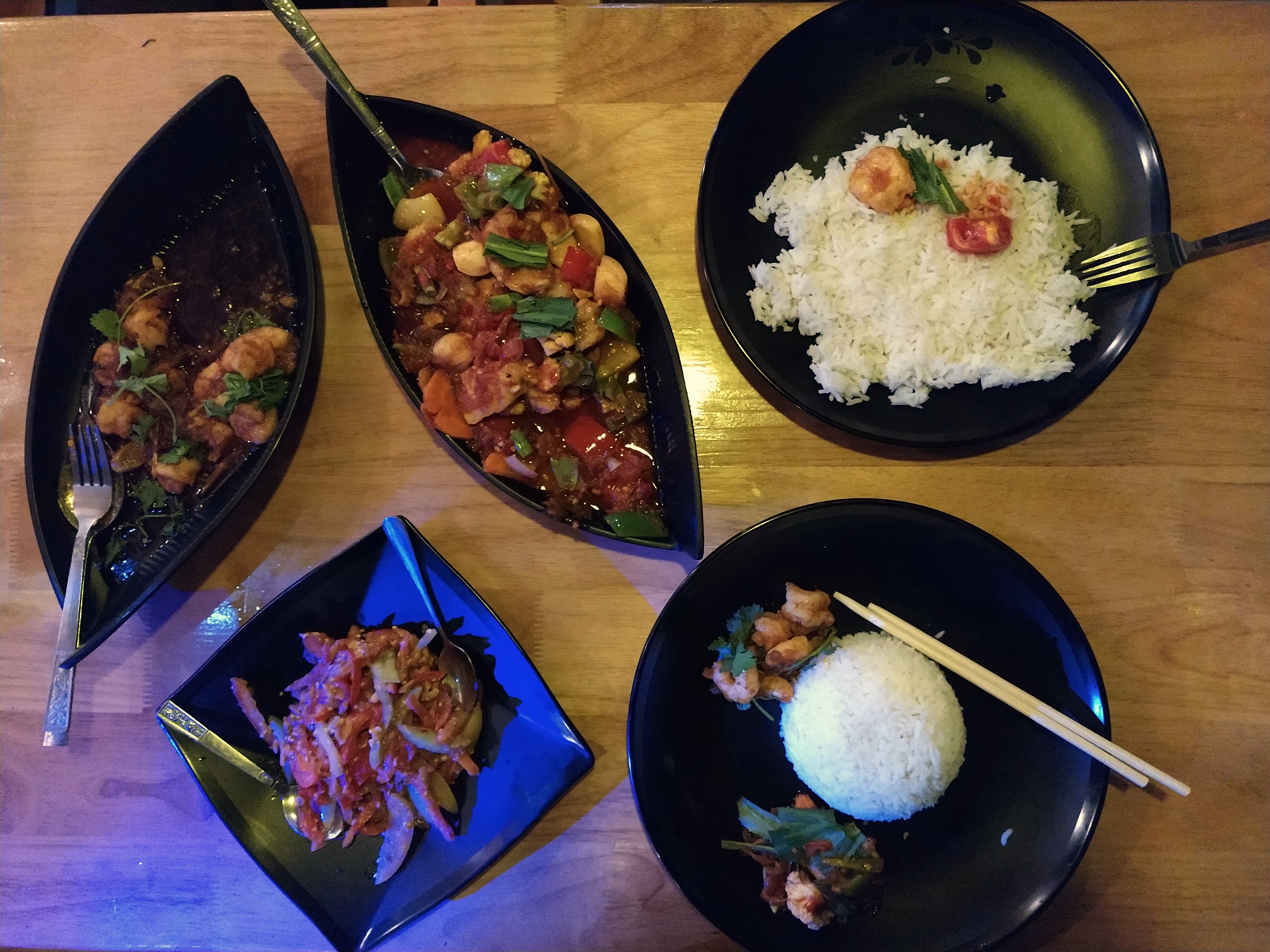 Nachdem wir uns sattgesehen haben gingen wir zu Fuß zum nahegelegenen Kandawgyi-Park. Dort genehmigten wir uns erstmal ein Alsterwasser gegen den Durst ehe wir mit dem Bus zum Bogyoke-Markt fuhren. Wir stöberten eine Weile durch die kleinen Lädchen und kauften das eine oder andere Andenken ehe wir uns – wieder mit dem Bus – auf den Weg zurück zum Schiff machten. Am Hafen gab es einen Nachtmarkt, wo wir noch Halt für das Abendessen machten – einen ganzen Fisch und gegrilltes Gemüse – ehe wir es uns in unserer Kajüte gemütlich machten.
