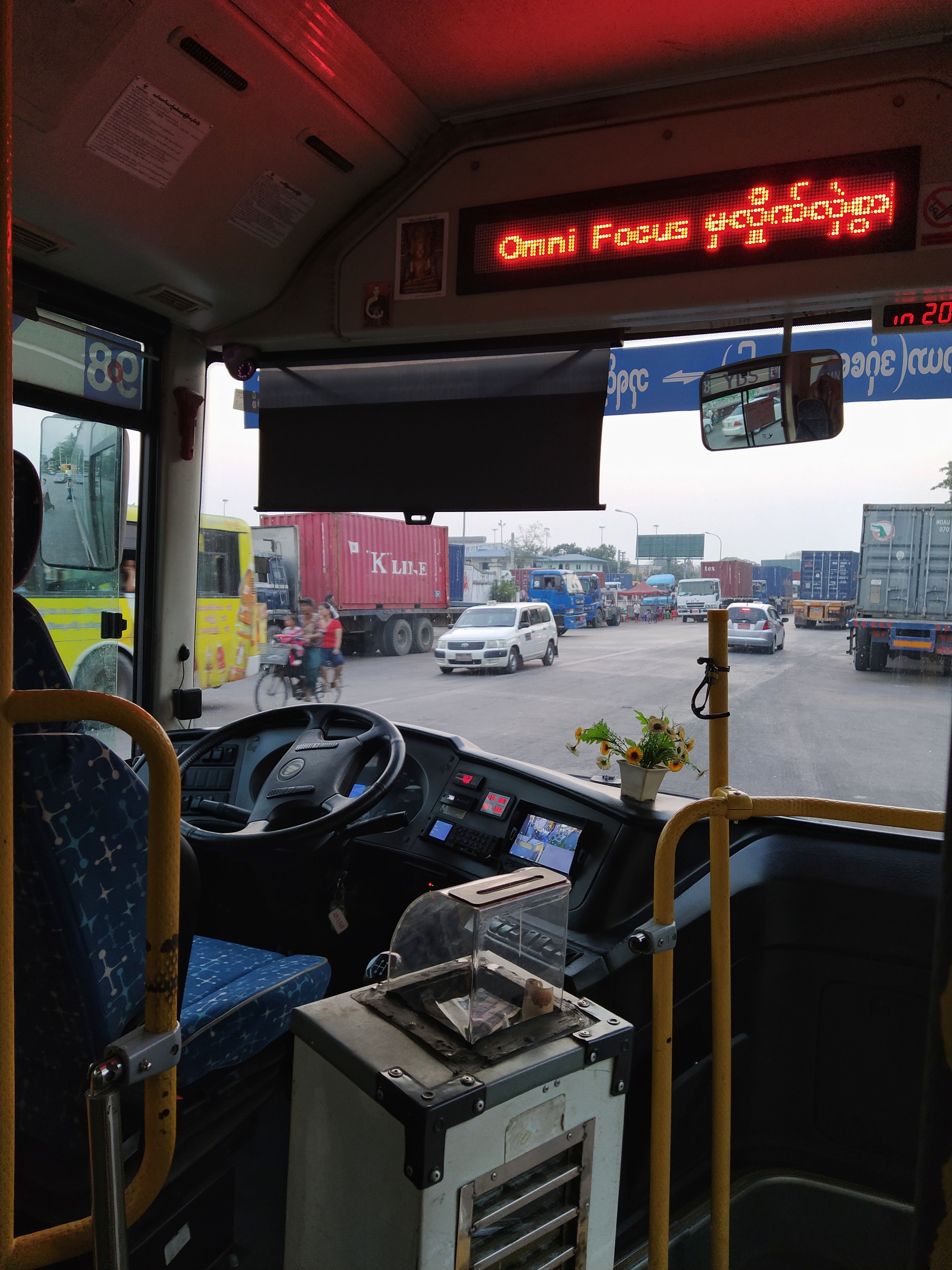 Gestern sind wir von Thandwe aus gegen Mittag nach Yangon geflogen. Auch das klappte wieder perfekt. Wir landeten am frühen Nachmittag. Bei der Suche, wie wir mit dem Bus fahren können, entdeckte ich eine App für das Bussystem in Yangon YPS und damit war es ganz einfach, die Linie herauszufinden, die uns in die Stadt bringen würde. Wir gingen zur Bushaltestelle. Nach kurzer Zeit kam der Bus und das Bezahlen war auch ganz einfach: In eine große Box wurde das Geld passend in einen Schlitz gesteckt. Das letzte Stück gingen wir zu Fuß. Unser Hotel, eine Luxusjacht – lag am Fluß ein wenig Abseits vom Trubel der Stadt.