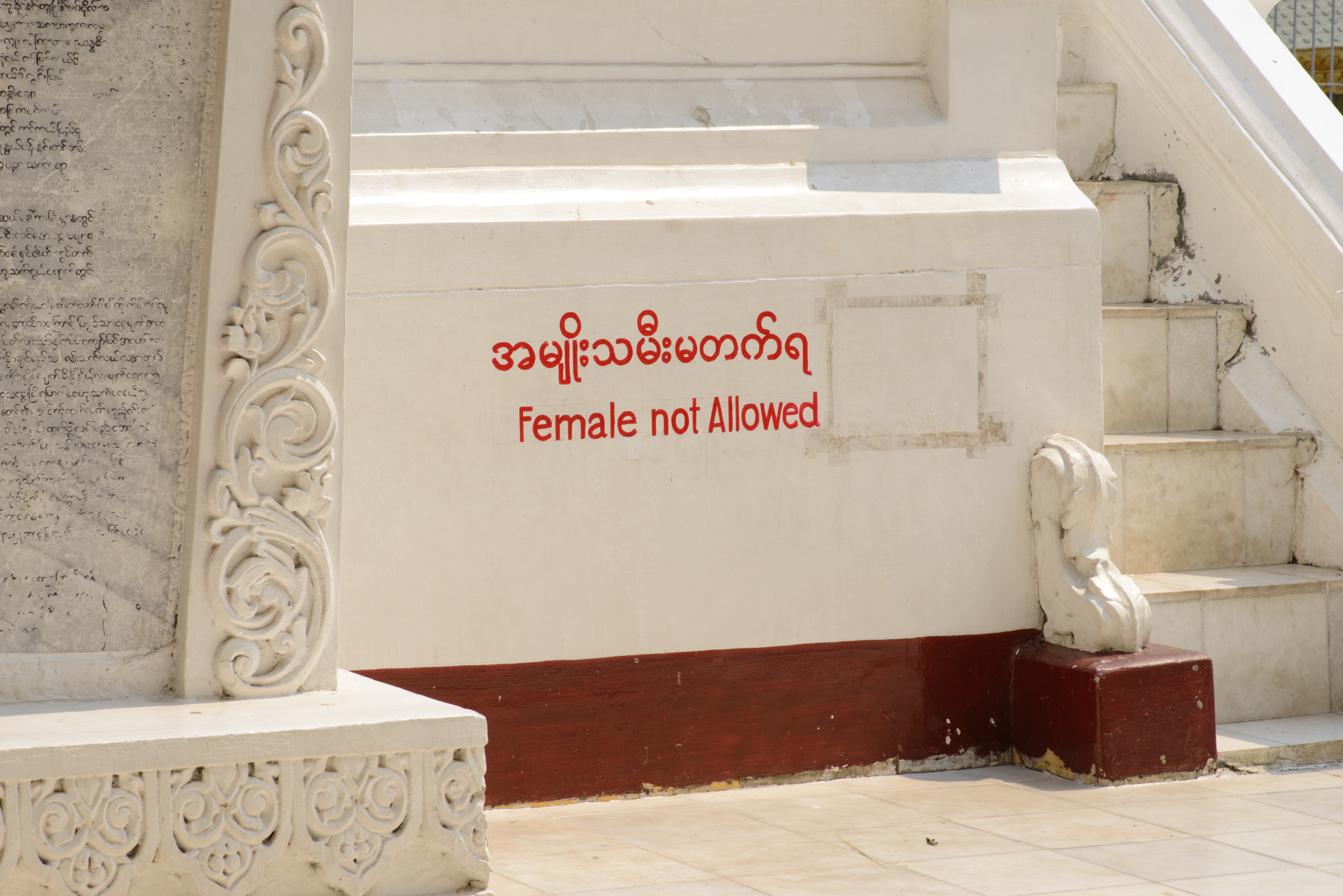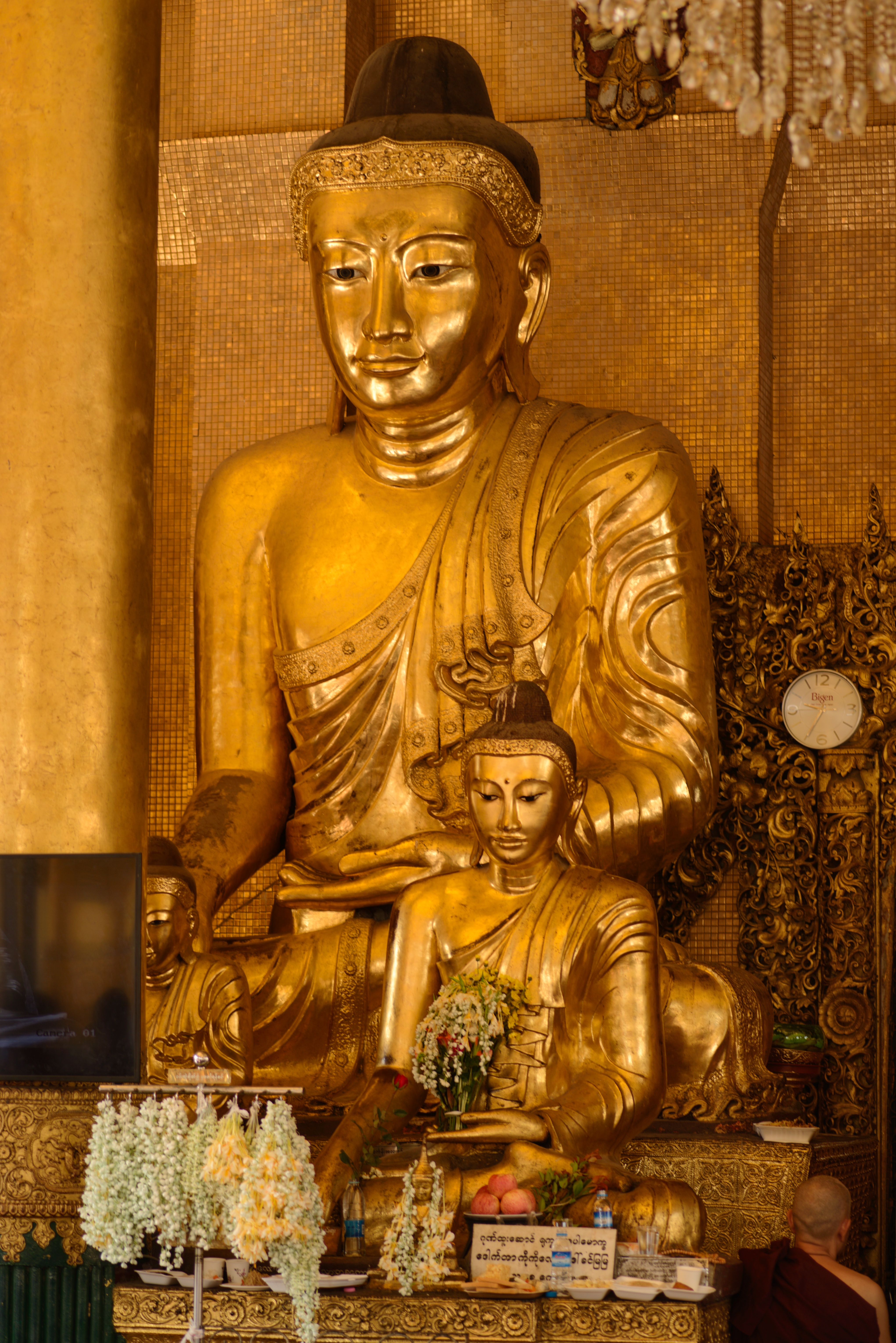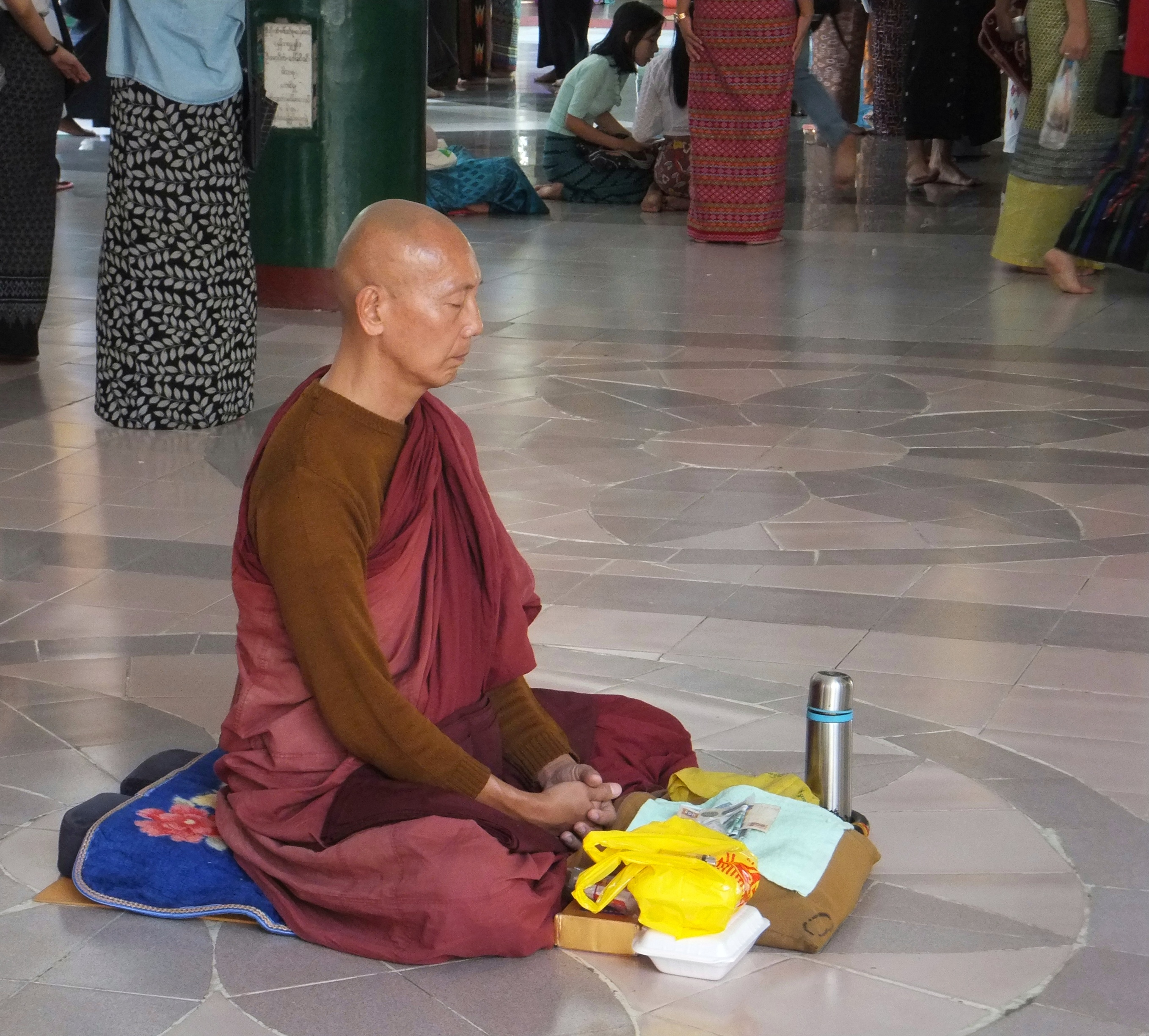 Heute machten wir uns auf, die Stadt zu erkunden. Wir nutzten den Shuttle-Service des Hotels und wurden direkt zur Shwedagon Pagode gefahren. Diese Pagode ist die größte uns schönste in ganz Myanmar und zieht Pilger aus dem ganzen Land an. Auch wir waren überwältigt von diesem Ort und genossen die friedliche Atmosphäre bei einem geruhsamen Rundgang um die Pagode herum. Es war sehr heiß und gelegentlich setzten wir uns hin und beobachteten die vorbeilaufenden Leute. Auch wir wurden beäugt und oft fotografiert. Zum einen, weil sich nicht viele Europäer hierher verirren, zum anderen weil sie begeistert sind, wie kunstvoll Michi seinen Longhi drapiert hat.