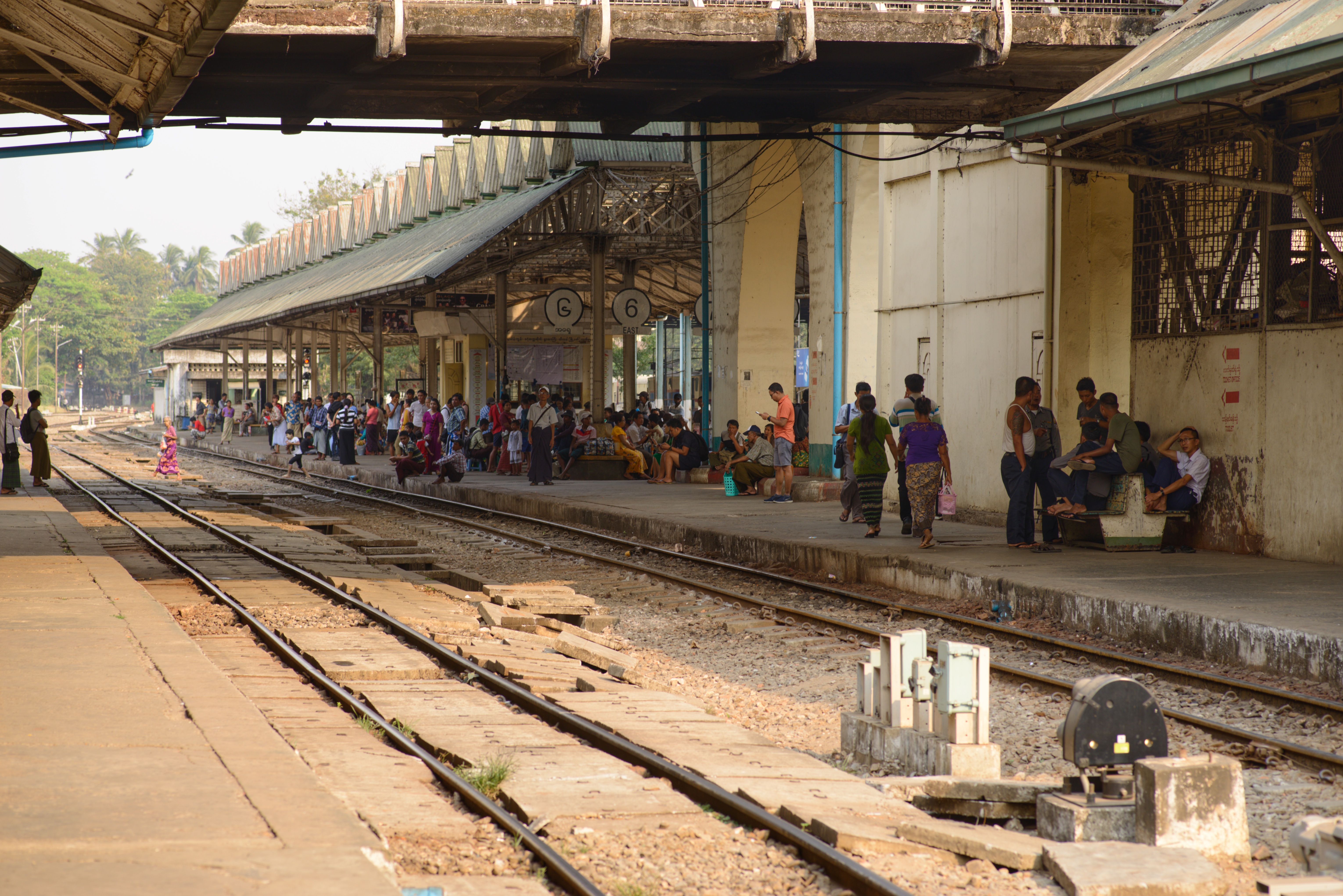 Nach dem Auschecken – das Gepäck ließen wir noch an Bord – spazierten wir zu dem Markt, den wir vor zwei Tagen schon einmal besucht hatten. Unterwegs fuhren wir im Sakura-Tower in die oberste Etage. Leider machte die Bar in der Dachterasse erst um 17:30 Uhr auf. Den Ausblick über die Stadt konnten wir so nur durch die Fenster des Lokals in der obersten Etage erhaschen. Wir gingen also weiter zu dem Markt. Danach holten wir unser Gepäck vom Schiff ab. Es war zufällig kurz vor drei, und wir fragten noch einmal nach dem Shuttle. Und tatsächlich hatten wir Glück und wurden von dem Fahrer direkt zum Hauptbahnhof von Yangon gefahren. Die Tickets für den Circular Train bekamen wir auf dem Bahnsteig von Gleis 6 und 7. Unser Zug in Richtung Osten fuhr jedoch von Gleis 4 ab. Wie alle anderen gingen wir über die Gleise zu unserem Zug. Wir mussten noch ein wenig warten, dann fuhr er jedoch pünktlich um viertel vor fünf los. Ein Teenager, der mit seiner Mutter unterwegs war, bot uns seinen Platz an, damit wir zusammen sitzen konnten. Das Angebot nahmen wir gerne an. Der Zug fuhr sehr sehr langsam und wurde von Station zu Station voller. Es war interessant das Geschehen im Zug zu beobachten. Es wurden Teppiche eingeladen und an der richtigen Station, wo schon etliche andere Teppiche standen von aussteigenden Passagieren auf den Bahnsteig gestellt. Eine junge Frau stand neben uns und gab ihre Handtasche für die Dauer ihrer Fahrt dem uns gegenüber sitzenden Teenager. Als sie ausstieg nahm sie die Tasche wieder an sich. Das beste war jedoch eine Frau, die ihr Baby einem offensichtlich Fremden in den Schoß setzte und erst wieder zurücknahm, als sie ausstieg. Und all das ohne jede Kommunikation. Wir stiegen gemeinsam mit dem Jungen aus, der uns dann noch ein Taxi organisierte, mit dem wir uns zum Busterminal fahren ließen. Dort aßen wir noch zu Abend ehe wir mit dem Nachtbus nach Hpa-An fuhren. Dort mussten wir die letzten Kilometer mit dem Taxi zum Hotel fahren, wo wir um drei Uhr morgens ankamen. Obwohl wir erst für den nächsten Tag gebucht hatten, bekamen wir wie selbstverständlich schon unser Zimmer und konnten uns erstmal gründlich ausschlafen. Auch dieser Tag zeigte uns, wie hilfsbereit die Burmesen sind.