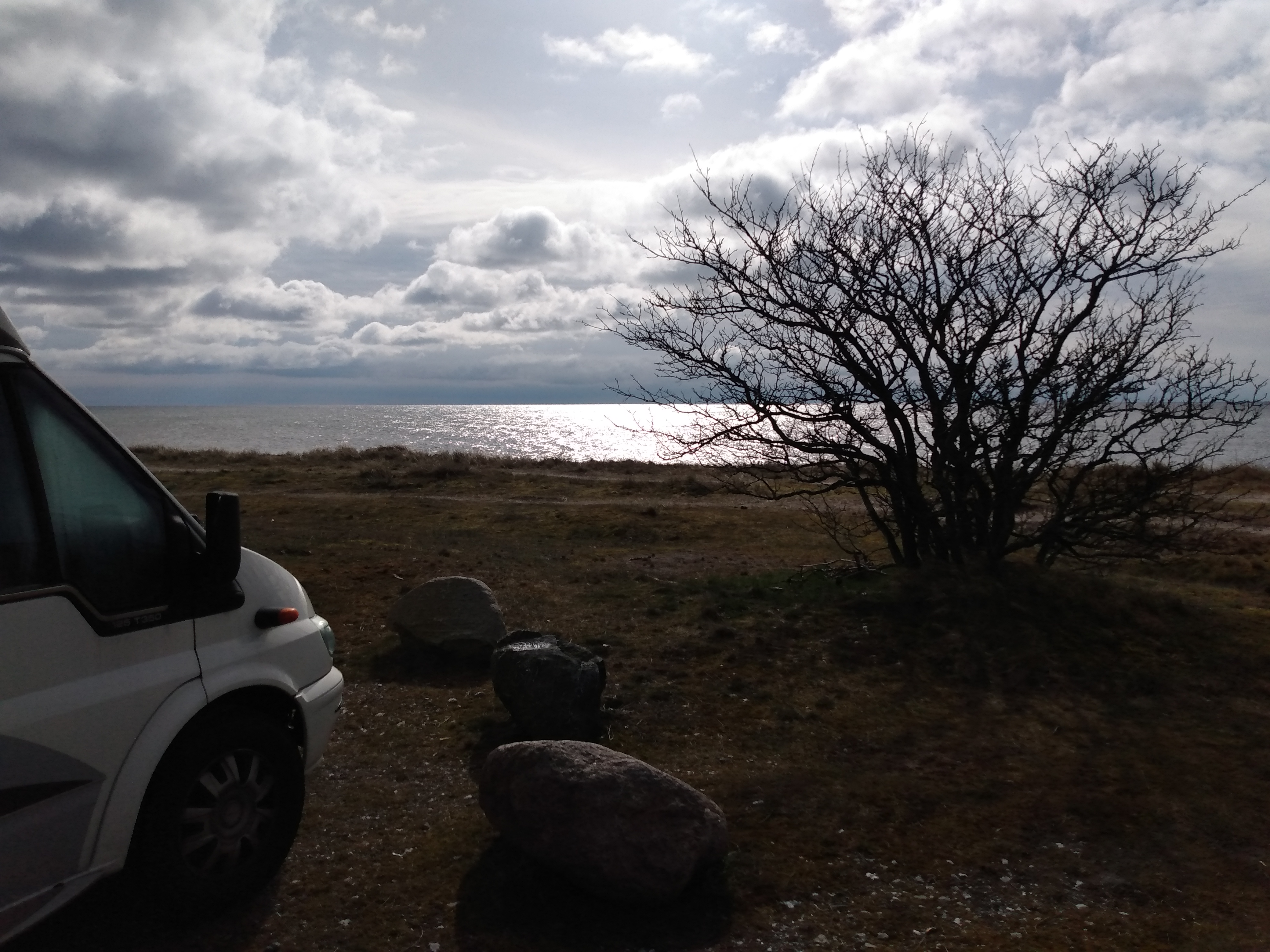 Etwas ungewohnt klingelte der Wecker morgens um 8:00 Uhr. Nach einem kleinen Frühstück und einer Tasse Kaffee fuhren wir in knapp 10 Minuten zum Fähranleger in Travemünde. Vor uns wartete nur ein Wagen und so hatte die Frau am Checkin schnell unsere Ausweise und den obligatorischen Corona-Antigentest kontrolliert. Wir stellten uns hinter die wartenden Fahrzeuge. Insgesamt waren es vielleicht 20 PKWs, darunter zwei Wohnmobile. Der Rest der Fähre wurde mit LKW-Auflegern beladen. Mit 1 1/2 stündiger Verspätung legten wir ab, kamen aber trotzdem fast pünktlich in Malmö an. Die Überfahrt verbrachten wir in unserer kleinen aber gemütlichen Kabine, wo wir kurz vor der Ankunft die vermutlich letzte richtige Dusche ausnutzten. In Malmö gab es überraschenderweise keinerlei Kontrollen und wir fragten uns, warum der Corona-Test unbedingt auf Englisch sein musste. Für die Übernachtung fuhren wir zu einem kleinen Strandparkplatz an der Südküste Schwedens und lauschten nach einem späten Abendessen dem prassen des Regens und dem Rauschen des Meeres.