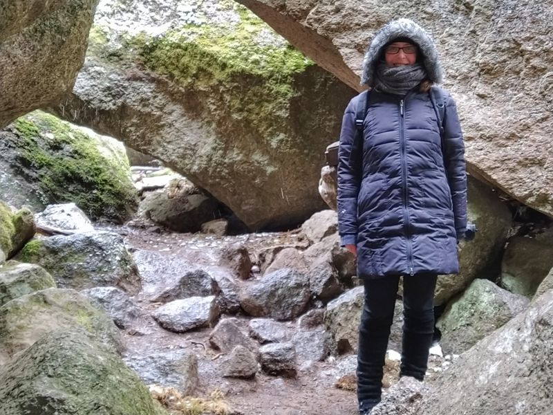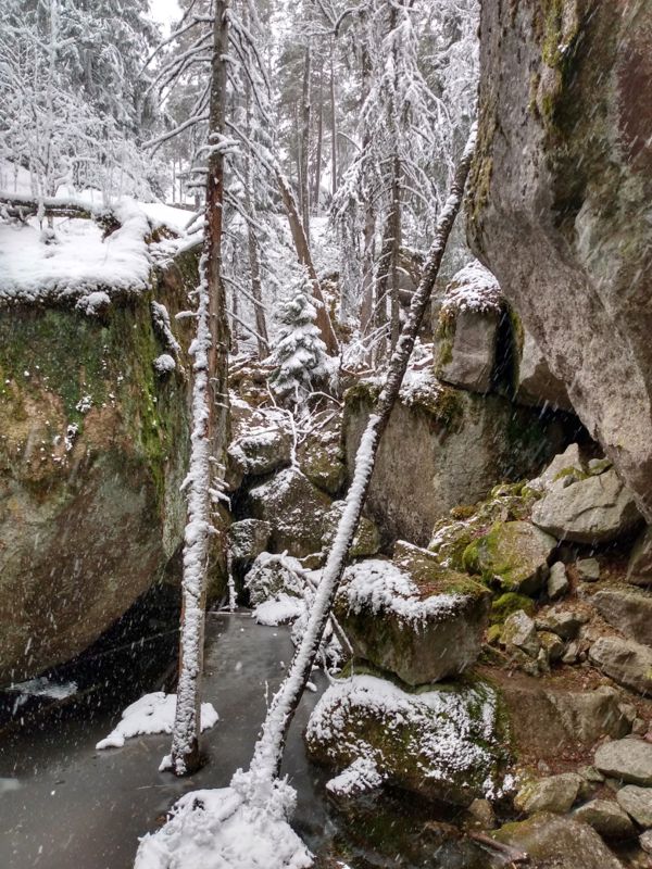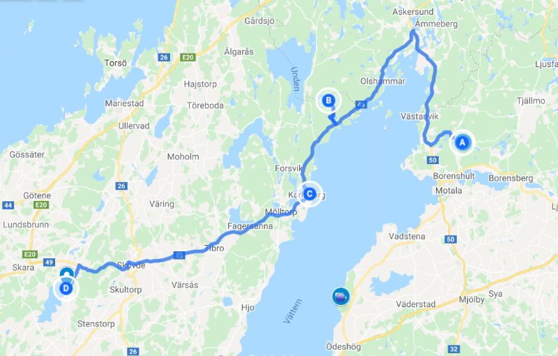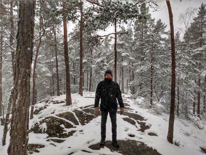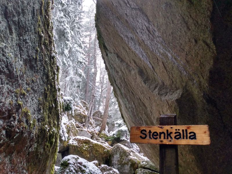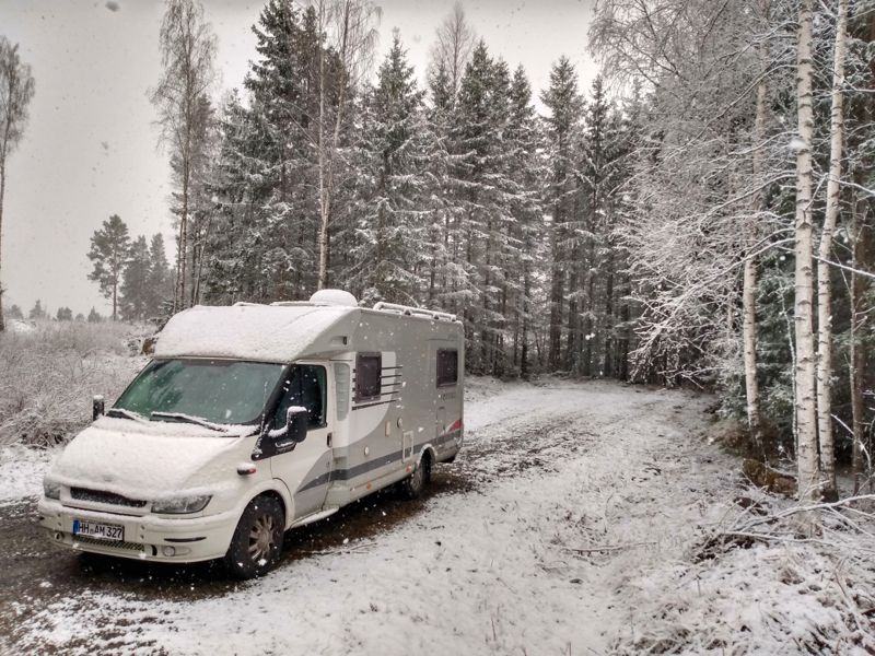 Es hat geschneit. In der Nacht hat es angefangen und als wir morgens aufwachen und aus dem Fenster sehen trauen wir unseren Augen kaum. Der ganze Wald ist schneeweiß und es schneit weiter. Wir machen uns für unsere Verhältnisse früh auf und fahren in den Tiveden Nationalpark. Es schneit noch immer und wir wandern und klettern auf knirschendem Schnee über Stock und Stein. Der Weg ist teilweise kaum noch zu erkennen aber die Markierungen an den Bäumen leiten uns dennoch sicher über den knapp 2 km langen Pfad. Ziel der Wanderung ist eine kleine Höhle, die sich unter einem gewaltigen Felsen gebildet hat, der durch die Eiszeit hierher getragen wurde. Immer wieder bieten sich schöne Ausblicke während wir durch die felsige Landschaft klettern. Und der Wald sieht mit dem vielen Schnee so viel schöner aus als die auf Frühling wartenden Wälder der letzten Tage. Nach der Wanderung fahren wir noch ein wenig mit dem Wohnmobil durch den Park ehe wir zu unserem nächsten Tagesziel der Festung Karlsborg fahren. Diese sah mehr nach einer großen Kaserne aus und nur eine halbe Stunde, nachdem wir Tiveden verlassen hatten, liefen wir wieder im Grünen herum und auch die Sonne kam schon wieder durch. Danach fuhren wir noch zum Einkaufen und an einem kleinen See fanden wir unseren nächsten Stellplatz. Wir erkundeten kurz den nahegelegenen Aussichtturm und sprachen kurz mit einem Mann, der gerade von dort kam und uns auf einen über den See fliegenden Seeadler aufmerksam machte. Er sprach sehr gut deutsch - eine echte Seltenheit hier.